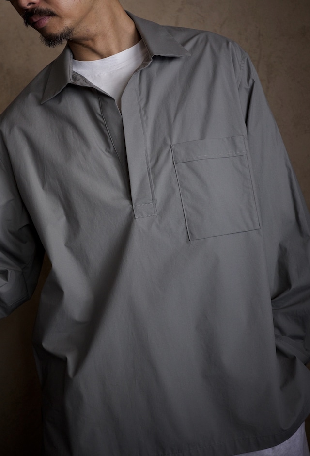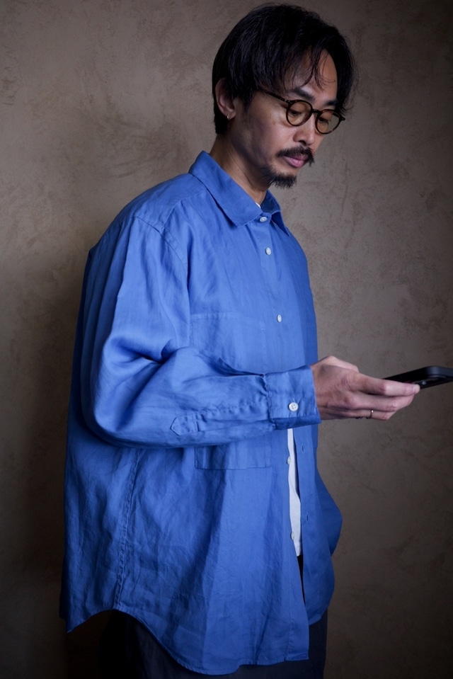 たっぷりとしたサイズ感は、羽織ものとして最高なシルエット。 シャツとしても良いんですが、羽織としても着てほしい一着です。 独特な風合いが特徴のコットン製品染のシャツは、ドライタッチで肌離れも良くリネンのようなさりっとした肌触りが気持ち良いです。 これからの季節に重宝する、ちょうど良いシャツ兼羽織ものです。 fabric : COTTON 100% size 46 : 着丈 75cm / 身幅 64cm / 肩幅 53cm / 袖丈 57cm size 48 : 着丈 77cm / 身幅 66cm / 肩幅 55cm / 袖丈 58cm size 50 : 着丈 79cm / 身幅 68cm / 肩幅 57cm / 袖丈 59cm model : Height 177cm / weight 68kg 着用サイズ 48 coordinate tee / BARAILLE&GARMENTS / RIDGEWAY Tee / size L https://www.iremono.shop/items/53023801 pants / ENDS and MEANS / work chino / size M https://www.iremono.shop/items/8879542