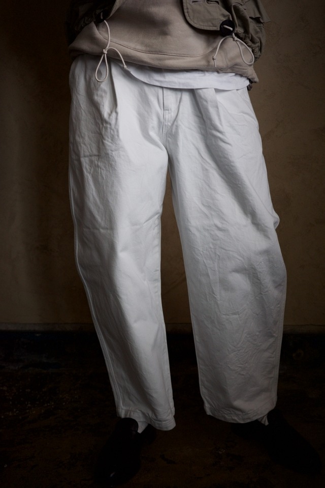 パンツの外をぐいっとカーブさせた特徴的なシルエットは、ワイドながら収まりの良い佇まいに。丈の長さもちょうど良く、太いけどだらしなくない絶妙な塩梅です。 今まであまり穿いてきたことのないシルエットなんですが、ちゃんとしっくりくる。なんだかとても中毒性が高い見た目に仕上がってます 縦糸に白、横糸に薄いグレーを配して、すこしくすんだようなホワイトに。明るすぎない絶妙な塩梅で、真っ白が苦手な方にもおすすめなカラーです。 着こなしを考えるのが楽しみになる、これからの一本です。 fabric : COTTON 100% size 44 : ウエスト 74cm / 股下 67cm / モモ幅 38cm / 裾幅 24cm size 46 : ウエスト 78cm / 股下 68cm / モモ幅 39cm / 裾幅 25cm size 48 : ウエスト 82cm / 股下 70cm / モモ幅 40cm / 裾幅 26cm model : Height 177cm / weight 68kg 着用サイズ 46 coordinate outer / another 20th century / River Runs Jacket / size 4 https://www.iremono.shop/items/93661688 parka / CURLY / SHANKAR HOODED ZIP P/O / size 2 https://www.iremono.shop/items/83070518 shoes / forme / Loafer / size 51/2 https://www.iremono.shop/items/64295255
