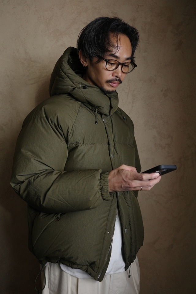 レトロアウトドアのスタイルをベースにしながらも、細部や生地感を現代的にアップデート。 どこか野暮ったさと、ほんのりのアウトドア感を残しながら、あか抜けた表情に。 この絶妙なさじ加減に、毎度毎度唸らされる。いなたさも愛せる羽織りもの 個人的にはボタンを閉めて裾を絞って着るのがおすすめです。このボリューム感と丸みのバランスが最高なんです。 高品質でお馴染みの河田フェザーのダウンとフェザーを採用しているから、もちろん暖かさは折り紙付き。 撥水してくれる表地に、左袖の小ポケット。裏にも二つの大容量ポケットに、ジップ付きポケットと、機能面でも抜かりなし。 細部まで丁寧に拘って、作り上げられた珠玉の一着。誠実で真っ当な服っていうのは、この服のことだと思います。 冬の外出が楽しくなる、とっておきのダウンです。 fabric 表地 NYLON 100% 裏地 POLYESTER 100% 詰物 DOWN 90% / FEATHER 10% size S : 着丈 68cm / 身幅 56cm / 裄丈 90cm size M : 着丈 72cm / 身幅 60cm / 裄丈 92cm size L : 着丈 75cm / 身幅 62cm / 裄丈 94cm size XL : 着丈 78cm / 身幅 65cm / 裄丈 96cm model : 日本人男性 Height 177cm / weight 68kg 着用サイズ L / 外国人男性 Height 175cm 着用サイズ L coordinate pants / STILL BY HAND / PT03244 / size 46 https://www.iremono.shop/items/93947634