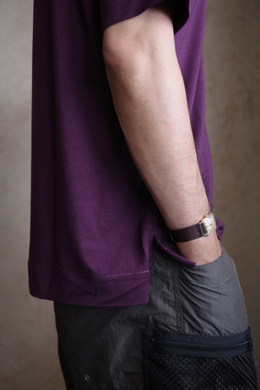 上質原料のスーパー100'sウールと、裏側にはポリエステルを使用したプレーティング天竺を用いたTシャツです。