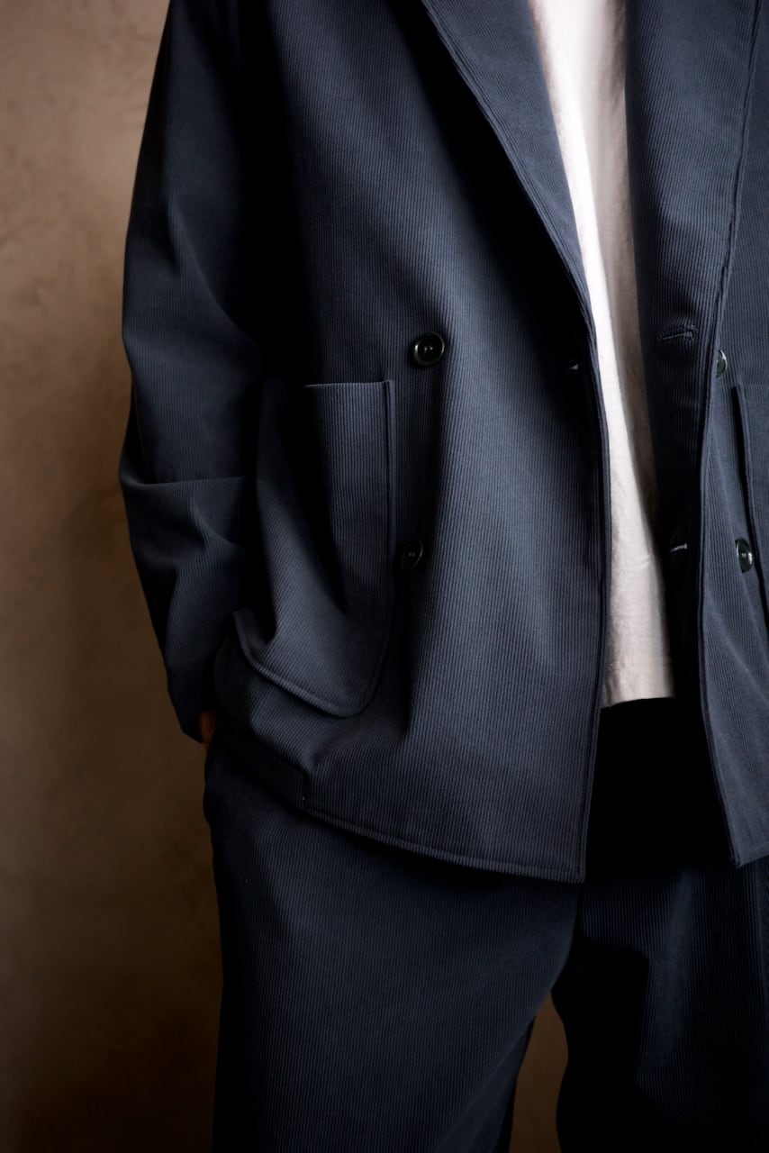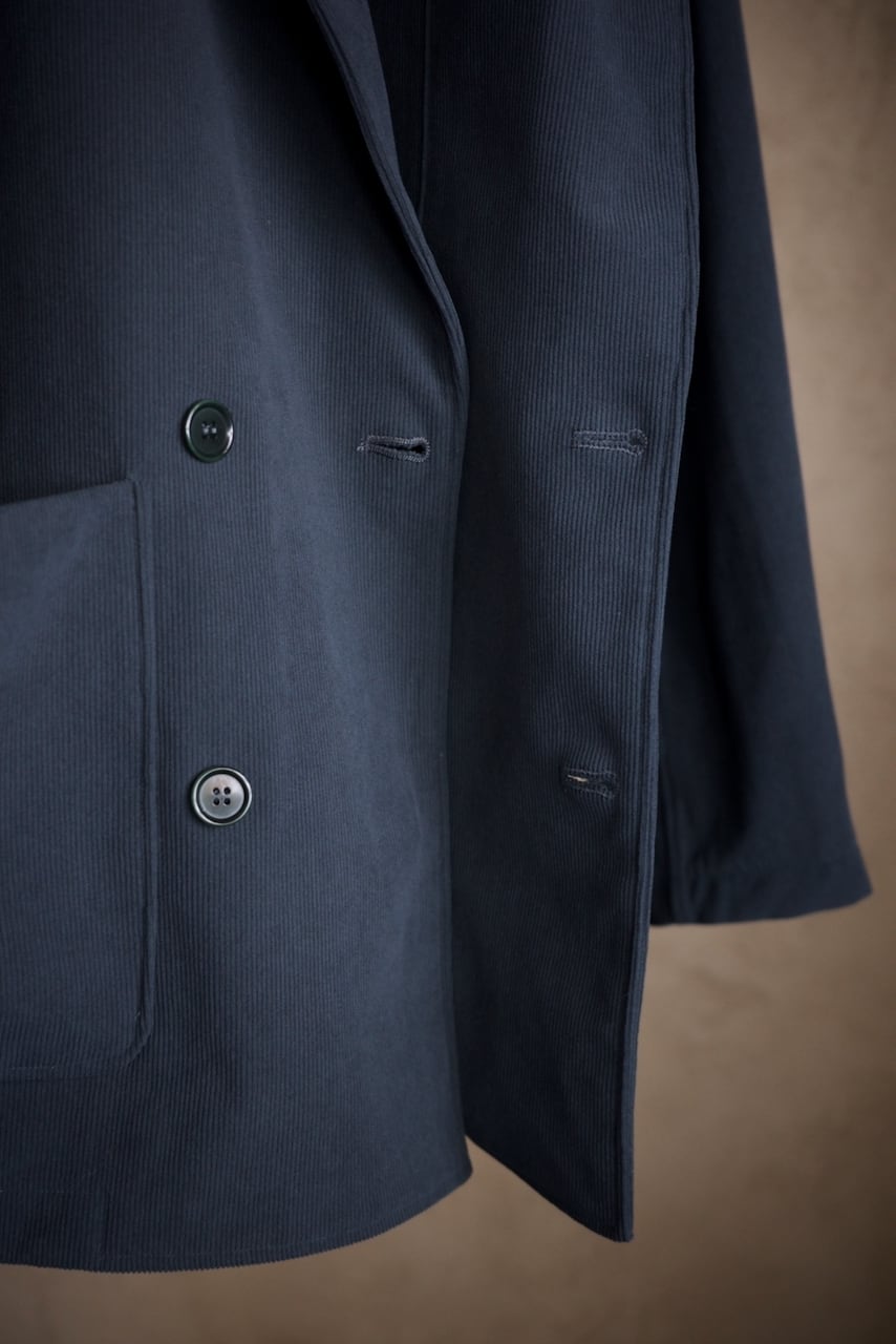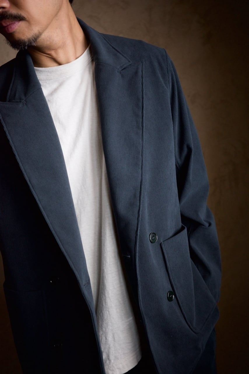 トリコット素材のポリエステルコーデュロイを用いた、セミピークドラペルの4ボタンダブルブレステッドジャケット。