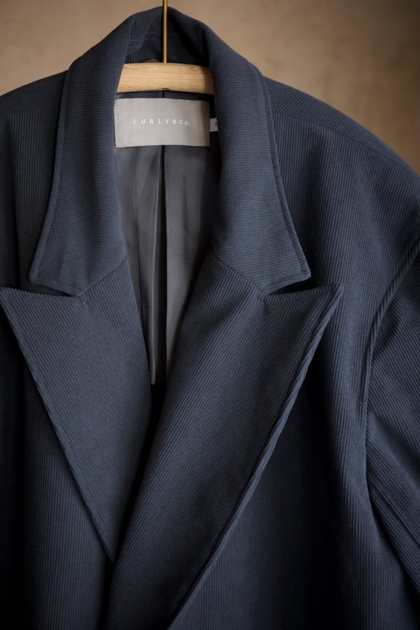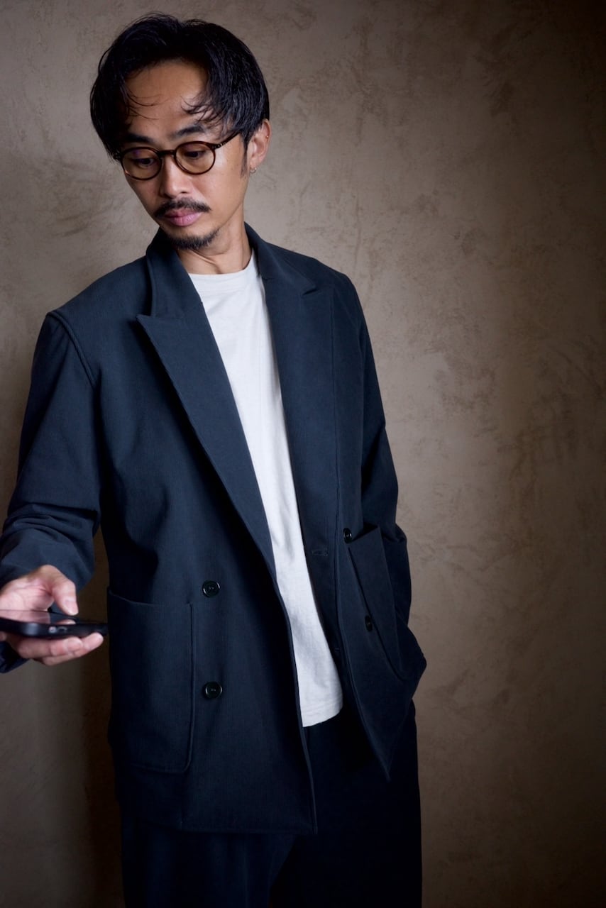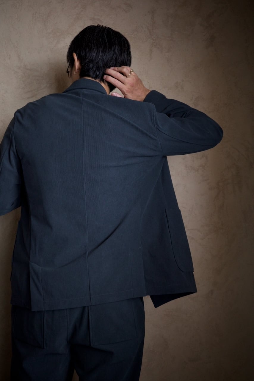 トリコット素材のポリエステルコーデュロイを用いた、セミピークドラペルの4ボタンダブルブレステッドジャケット。