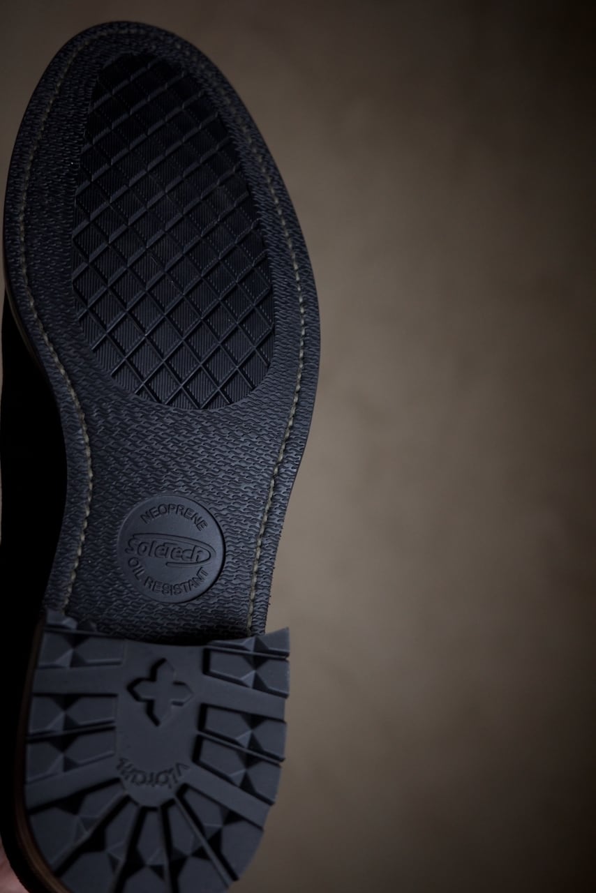 雨や雪用の靴としても使いたかったので、ソールはsoletech+vibramを組み合わせたラバーソール仕上げにしました。これに防水スプレーを組み合わせれば完璧。普通の雨ならこれで十分です。
