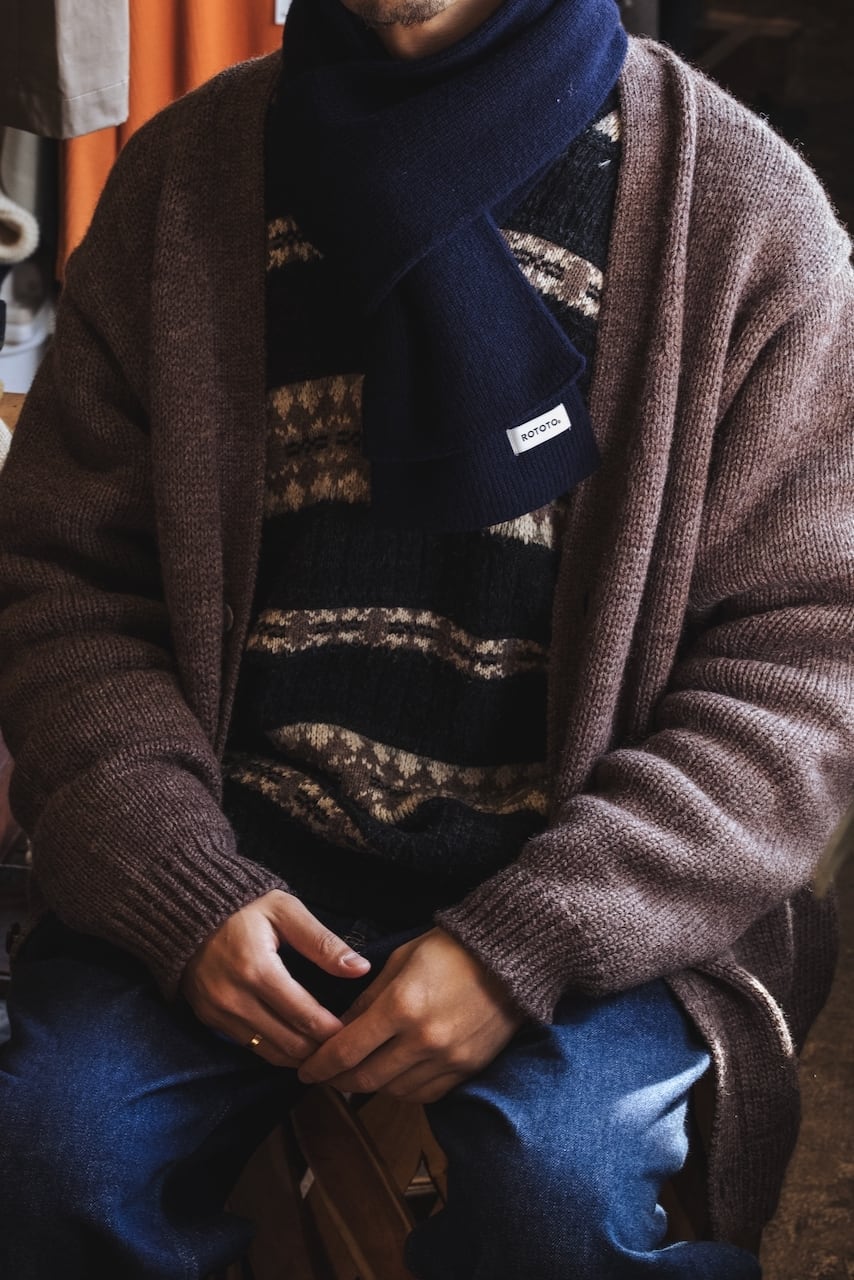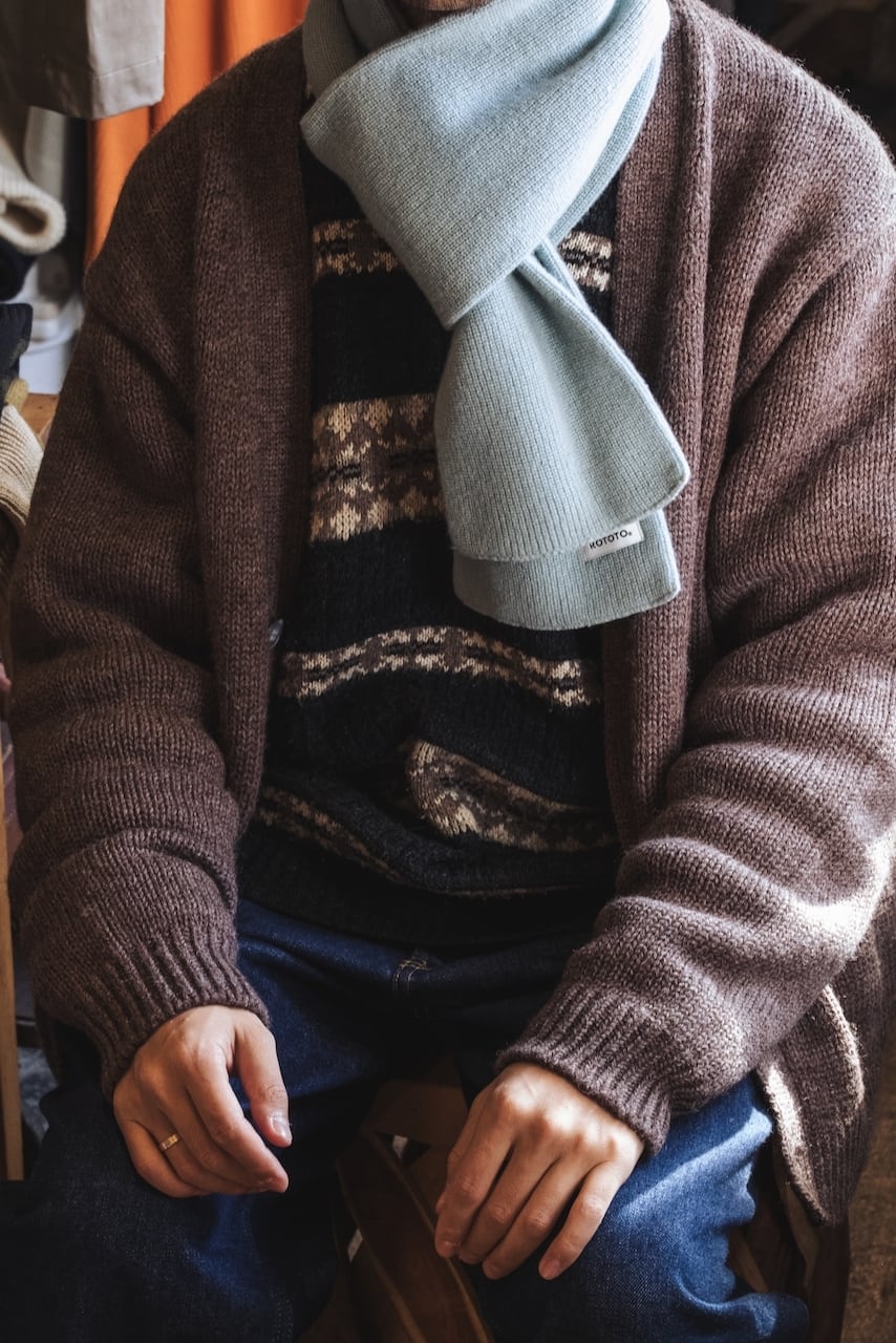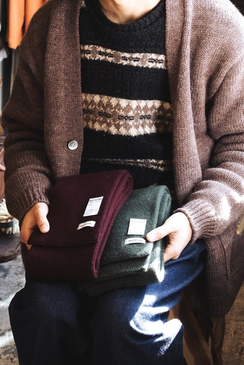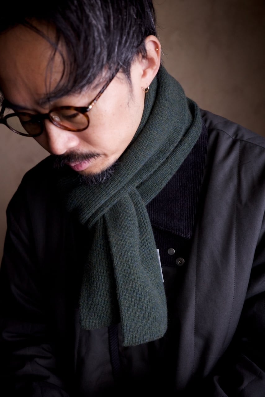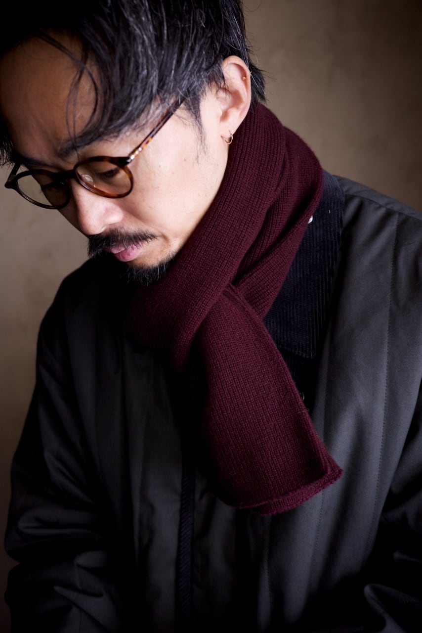 ミリタリーのチューブマフラーから着想を得て、靴下の編み機で編み立たニットストールは、その長さと幅が絶妙です。
