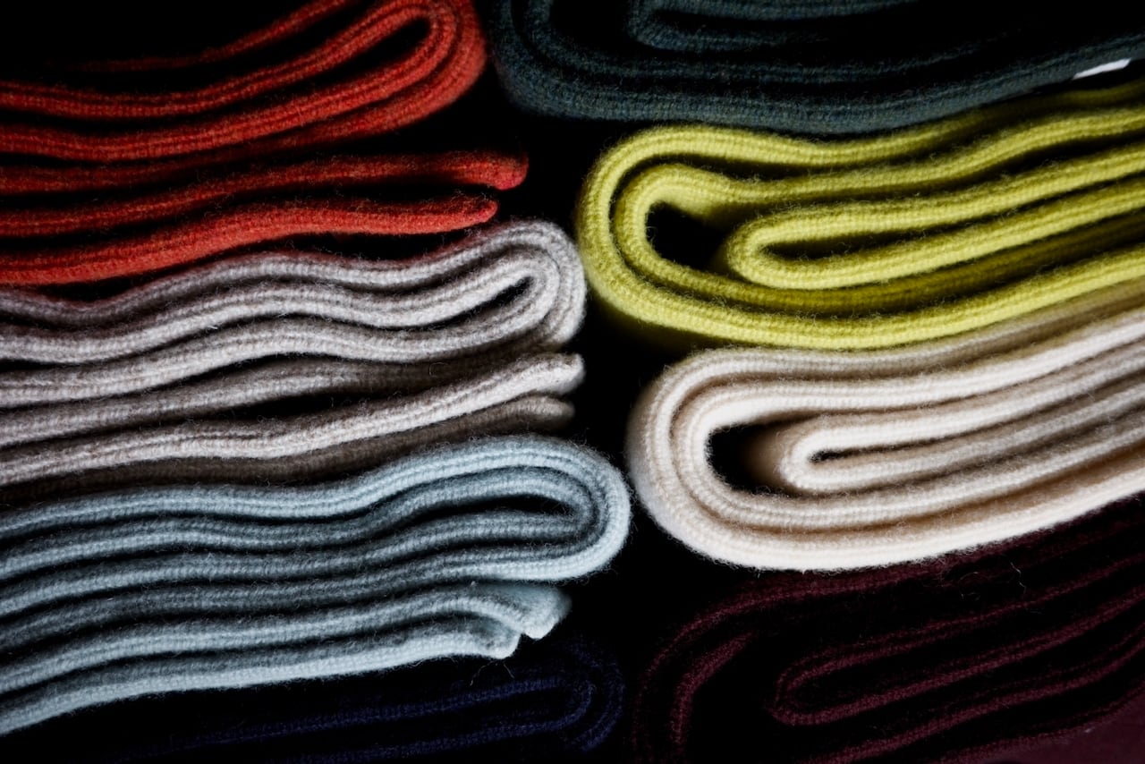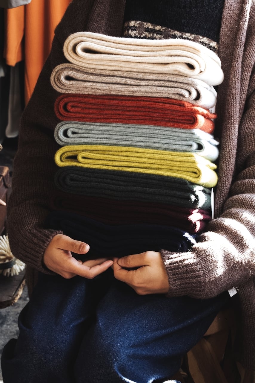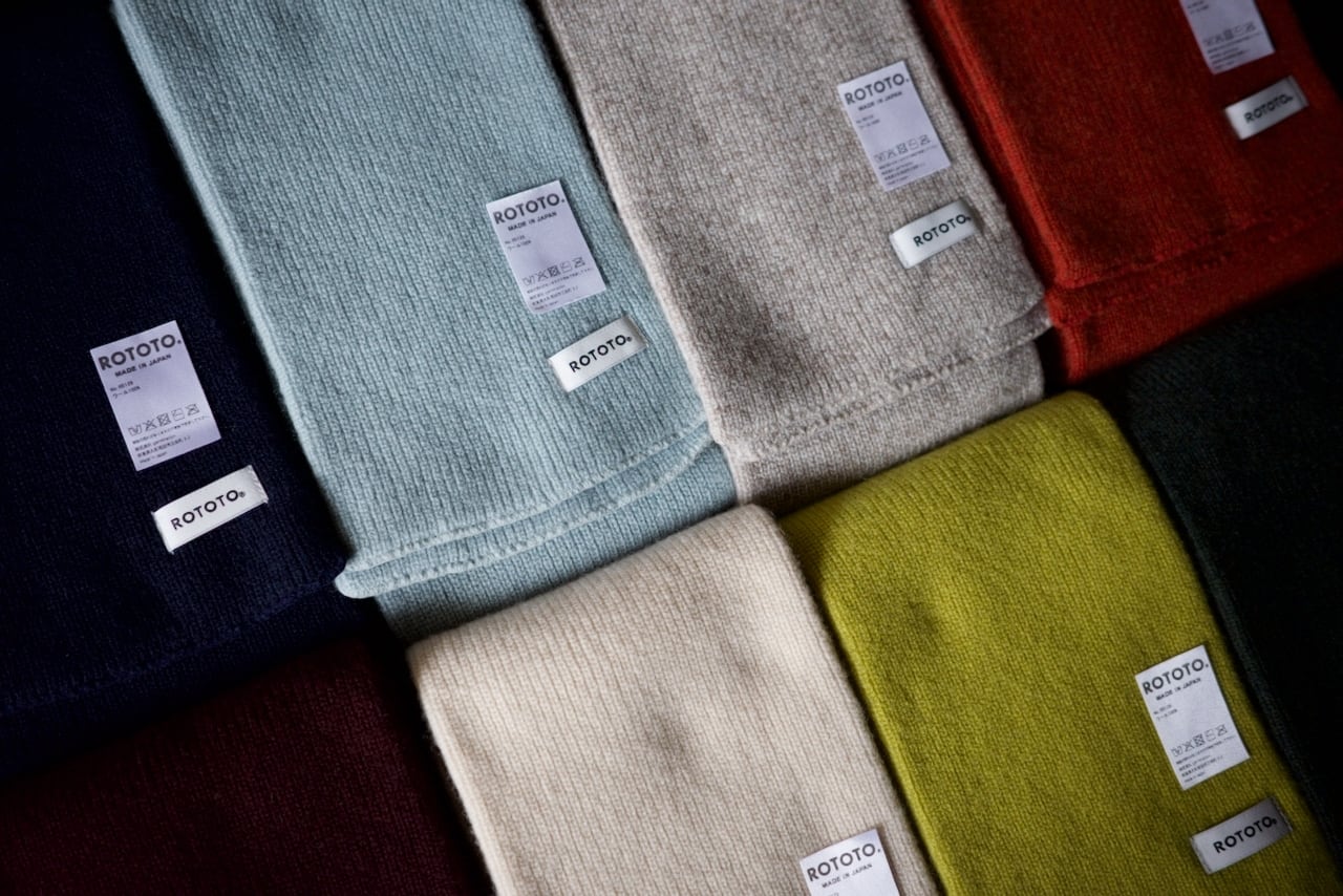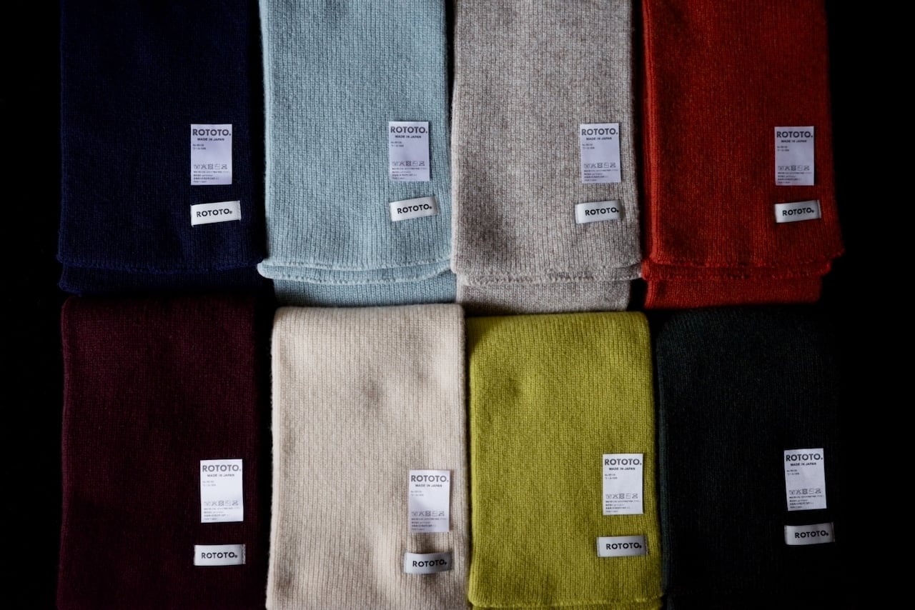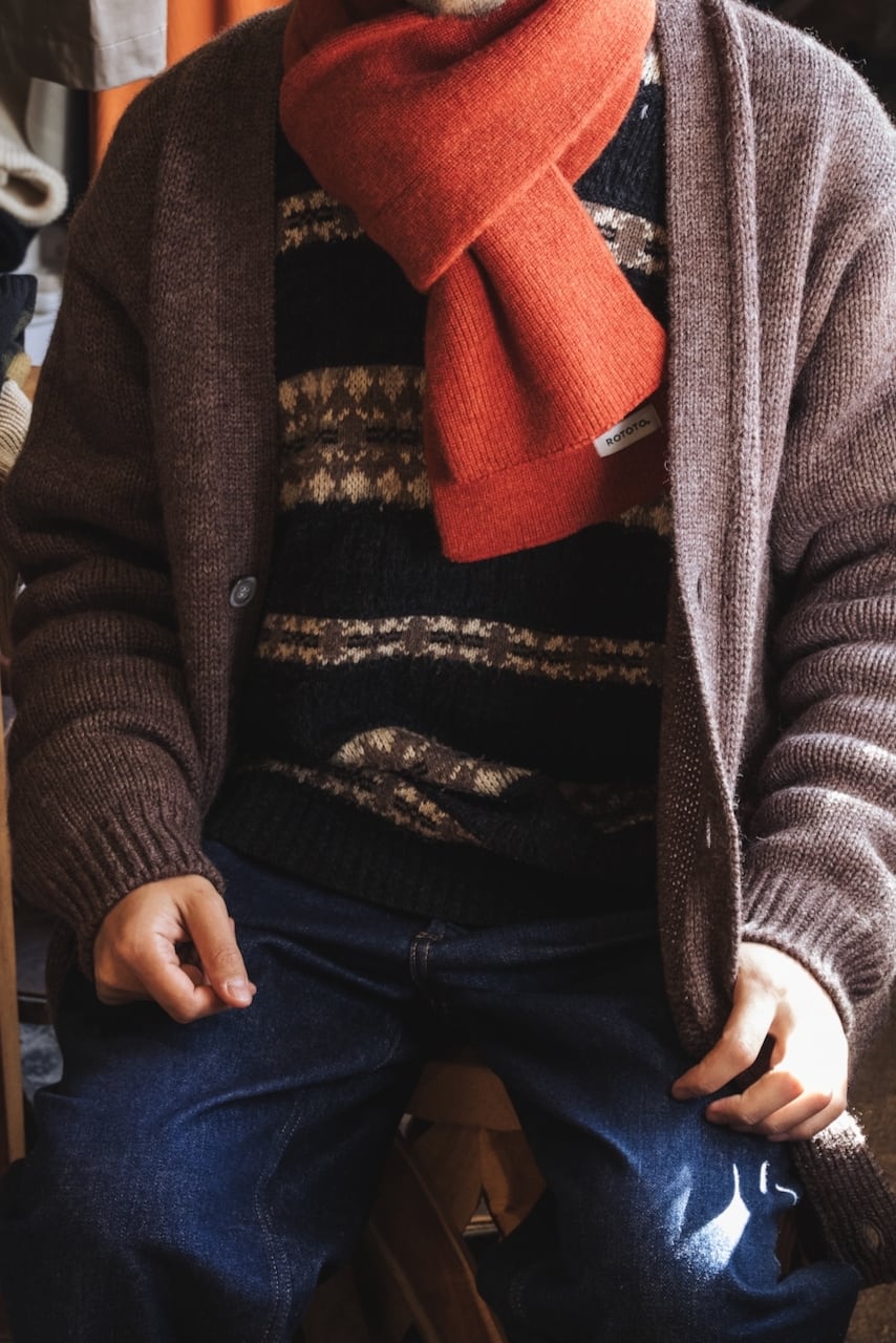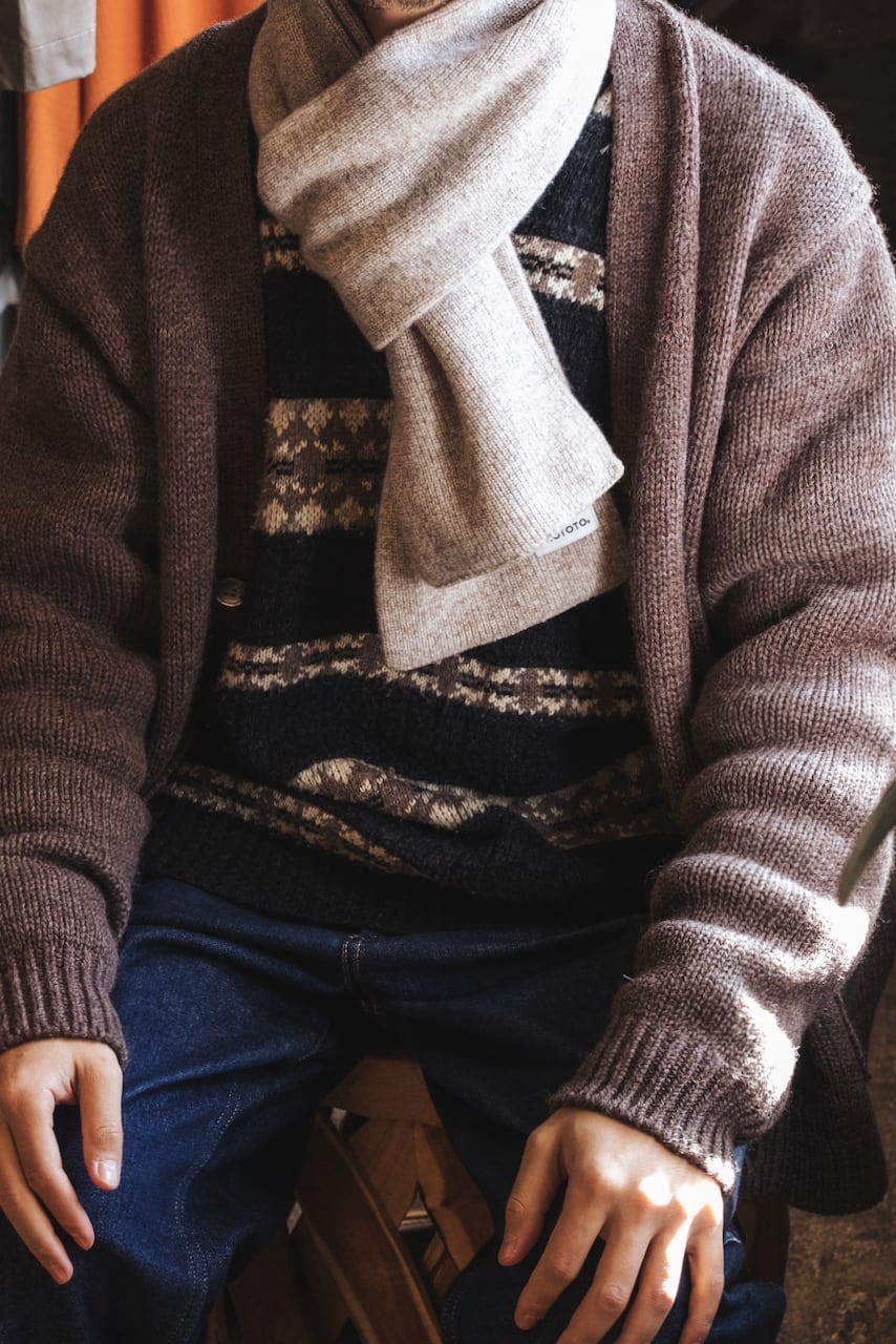 ミリタリーのチューブマフラーから着想を得て、靴下の編み機で編み立たニットストールは、その長さと幅が絶妙です。