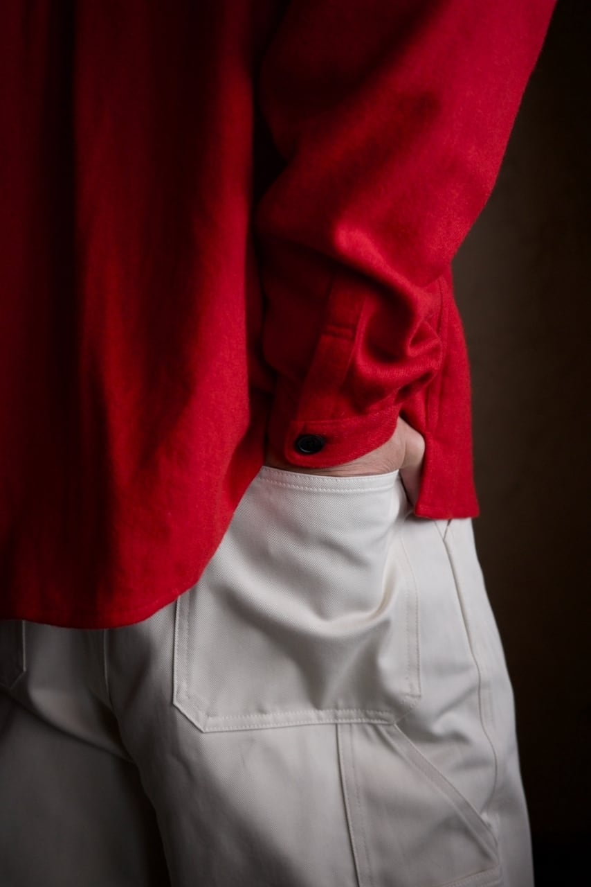 脇まで広がった特徴的な大きめ胸ポケットは、ダブルステッチが引き立てていて着用した時の見え方も逸品です。