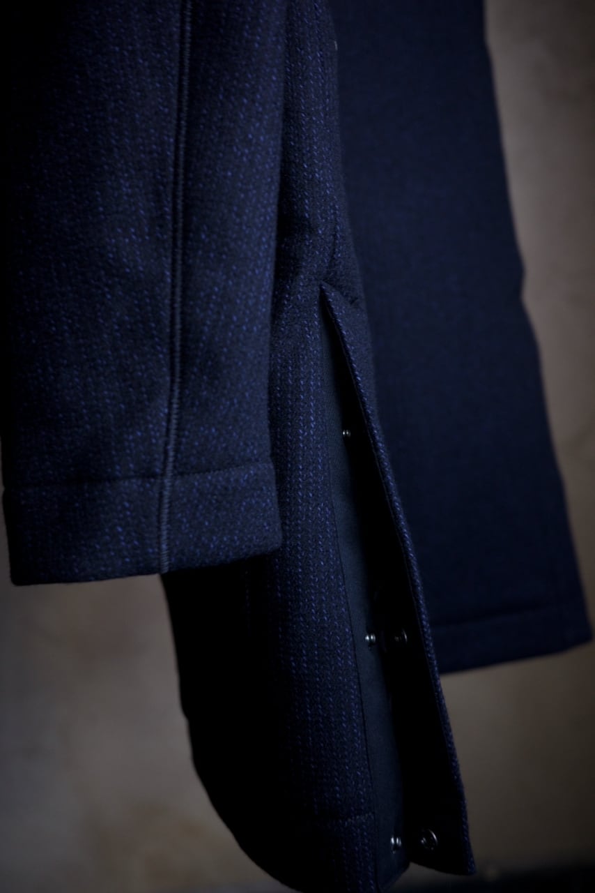 装飾も敢えて削ぎ落としつつ、トラディショナルな留め具やトグルを生地に馴染むカラーに統一してモダンな雰囲気に。