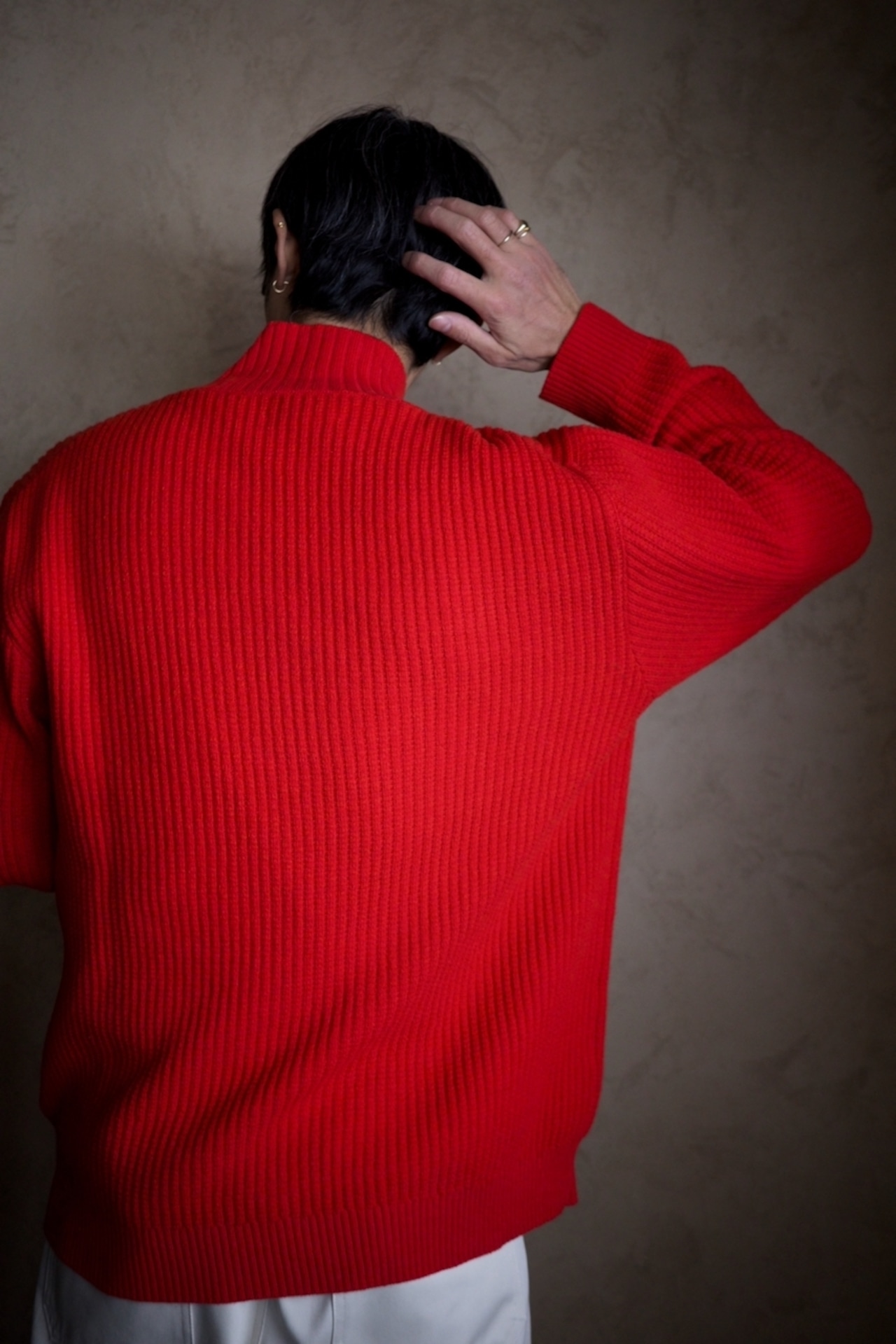 コートやアウターの下に忍ばせても存在感のある骨太ニット。暗くなりがちな冬のコーディネートにぜひ添えてみてください