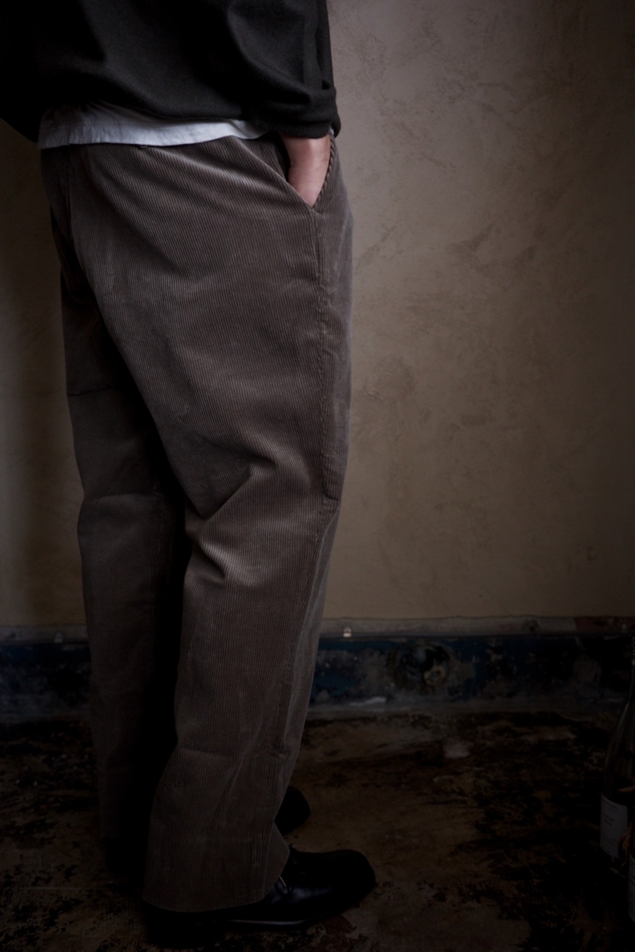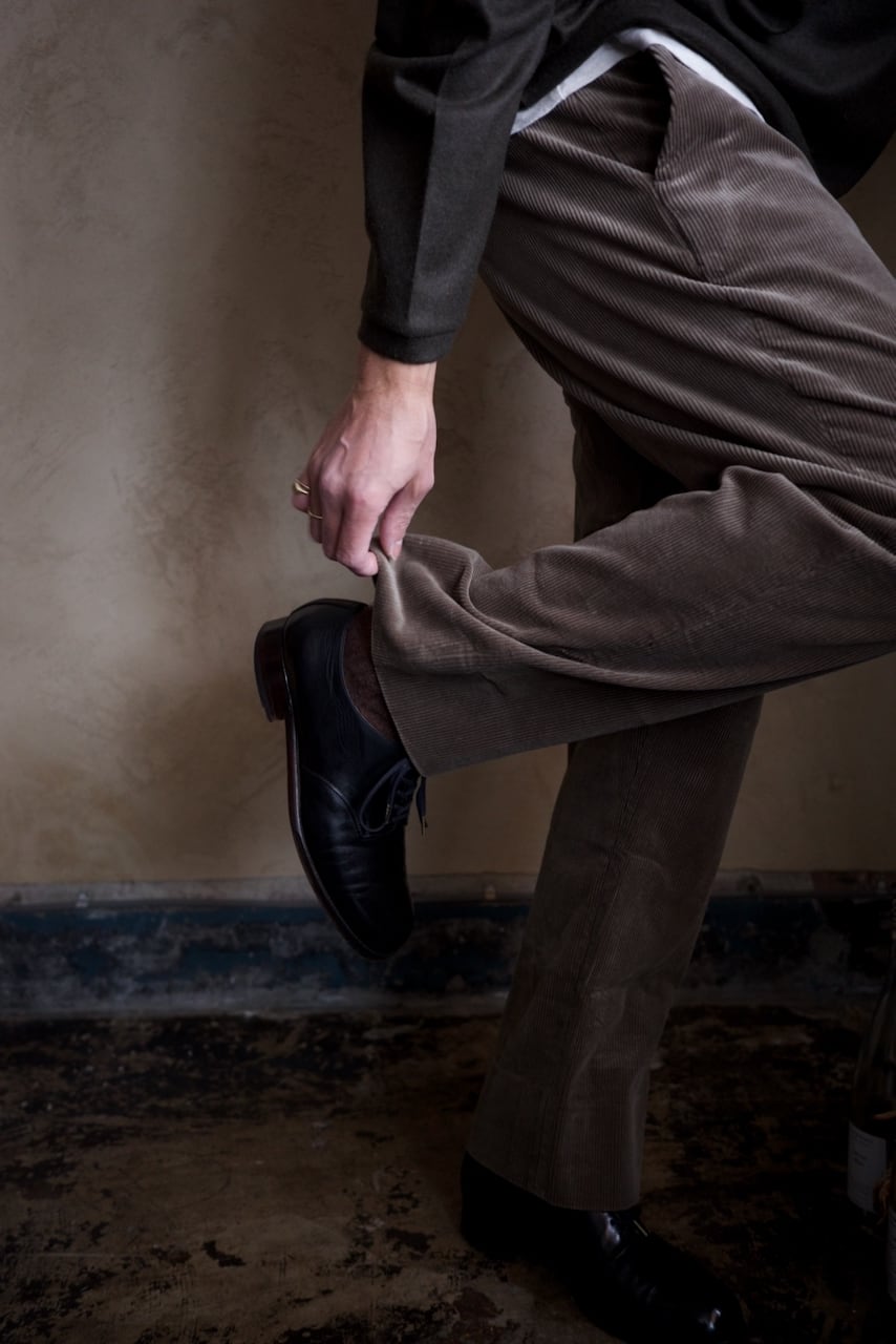 ゆったりとした腰回りに、足首に向けて淀みなく流れていく美しいシルエット。そして、色っぽさを付加