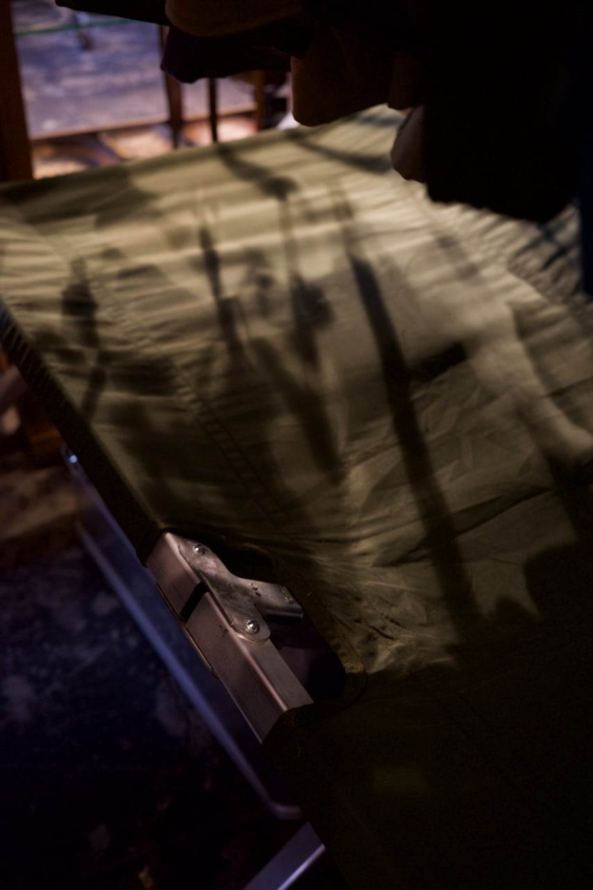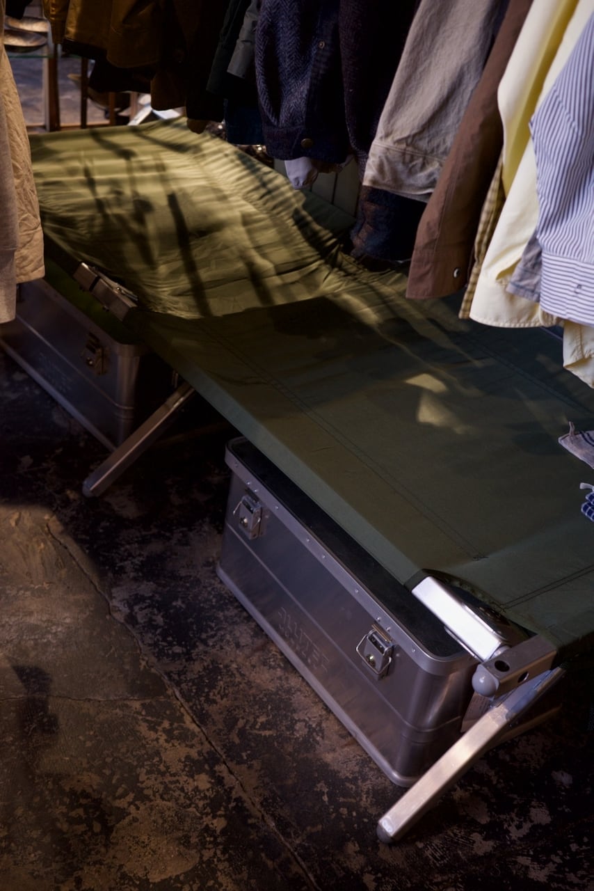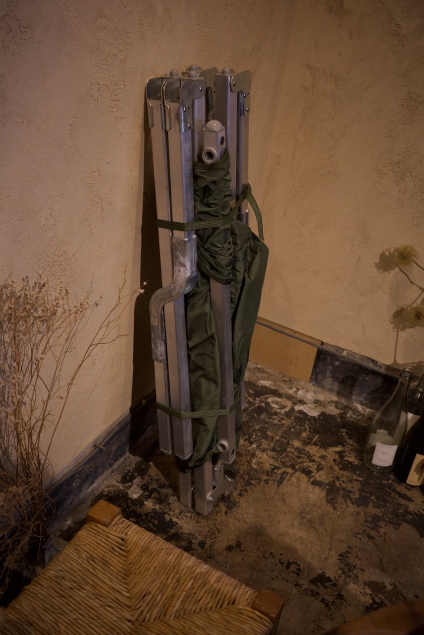 アルミとオリーブのコントラストも抜群なコットです。インテリアにもぜひどうぞ