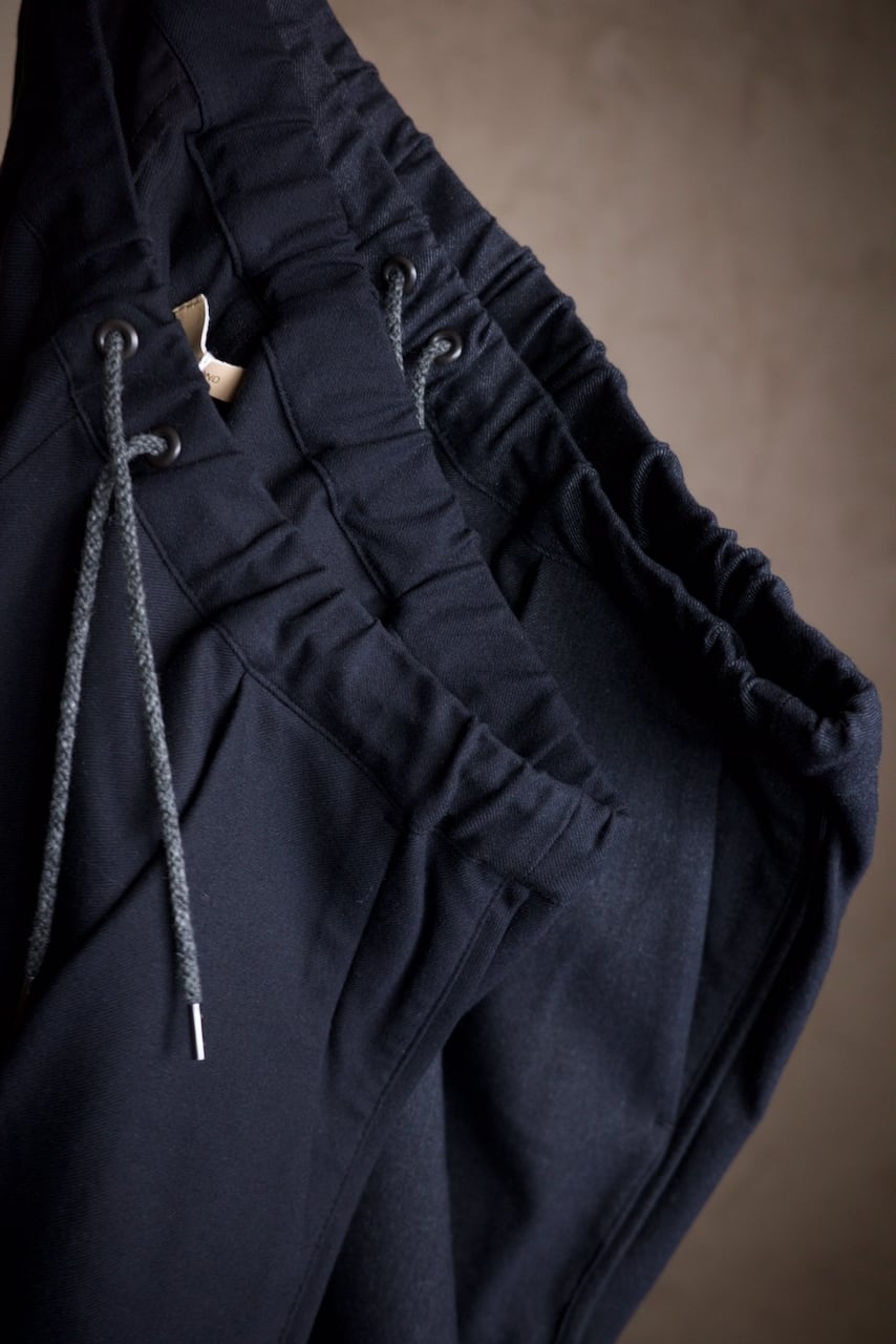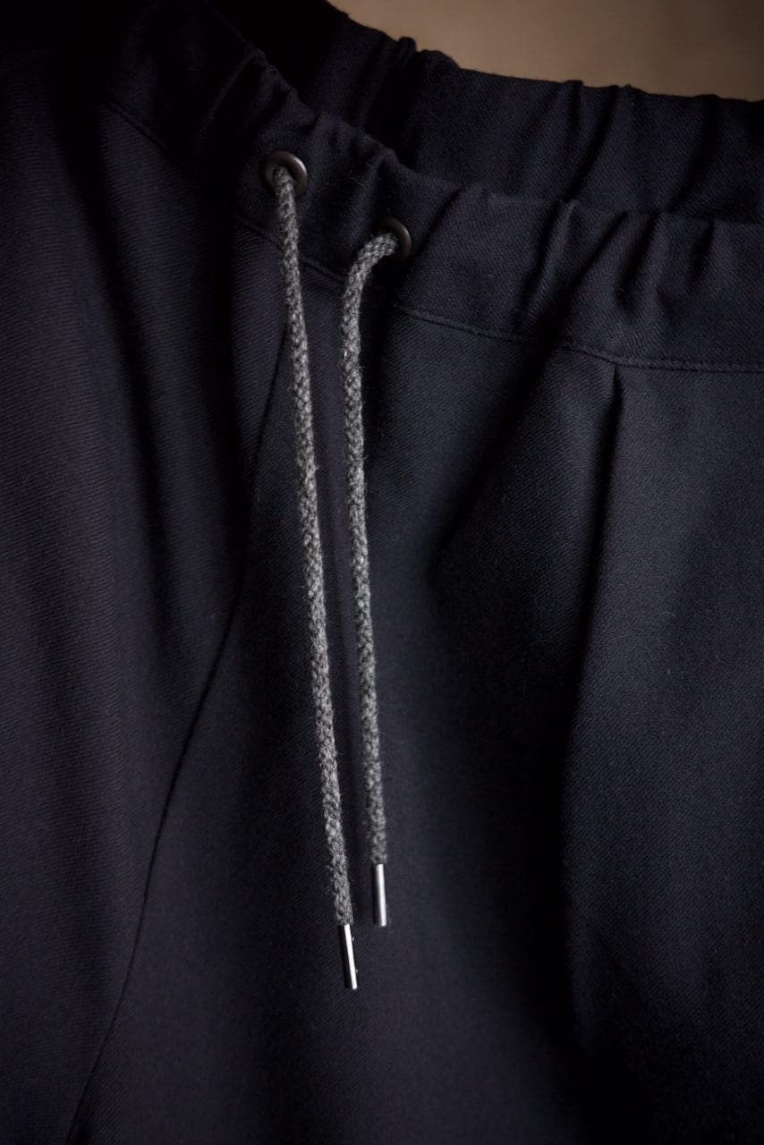 落ち感も良く、サイドのさりげないラインがほど良きアクセントに。ウエストもゴム+紐のイージー仕様なので、着脱も楽々