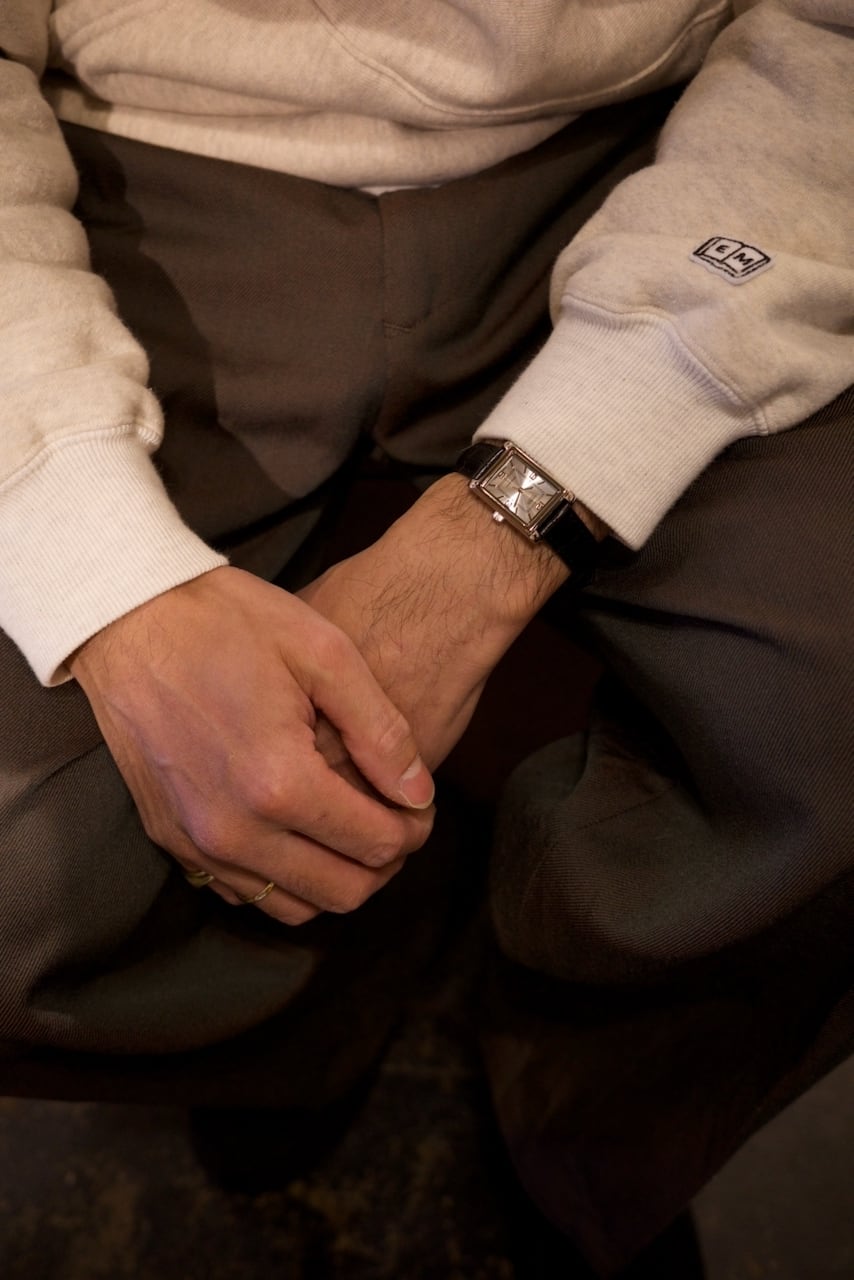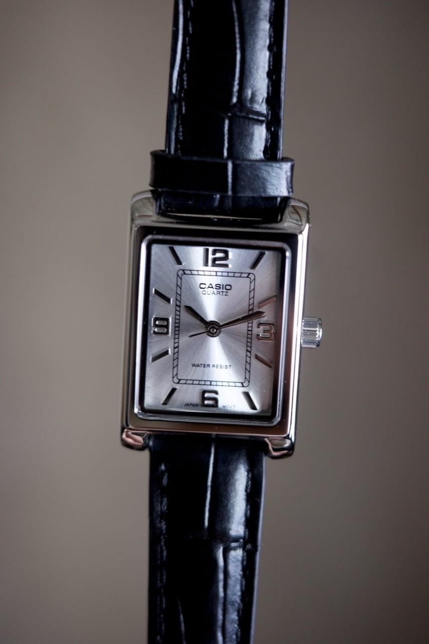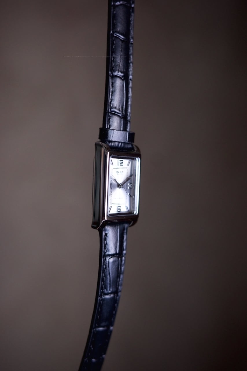 シルバー×シルバーの上品な文字盤。洗練されたレクタンギュラーのデザインも良い佇まいです。