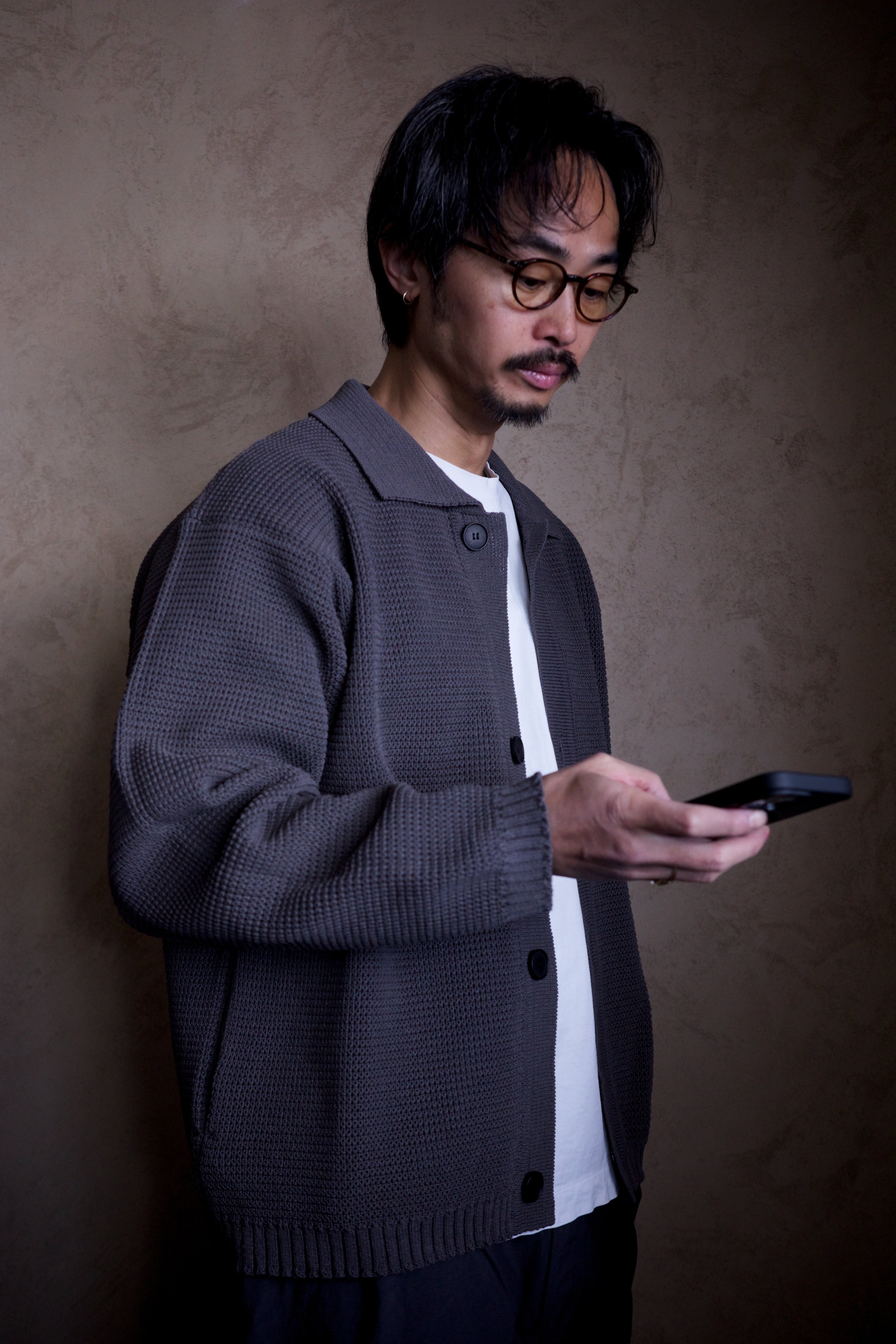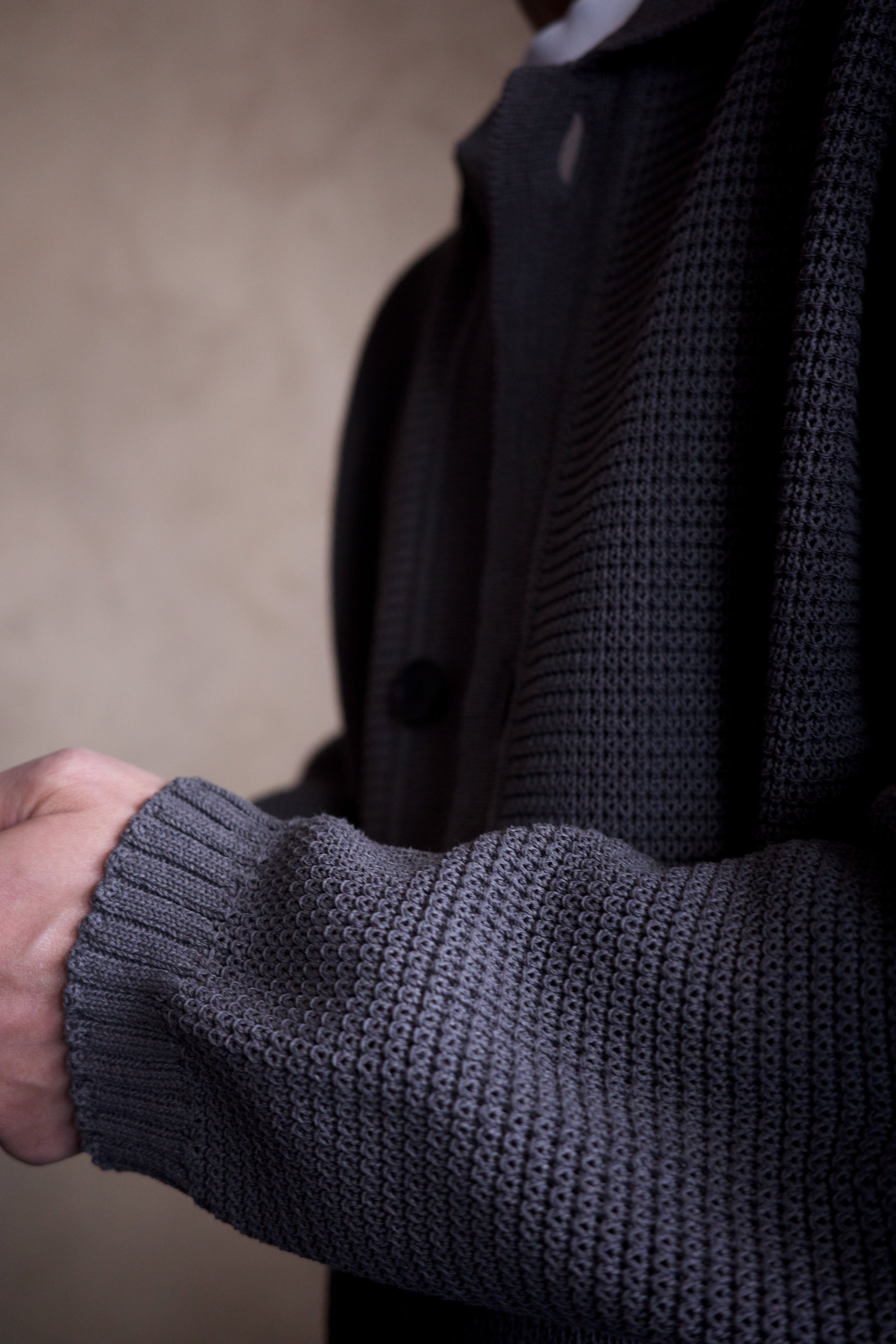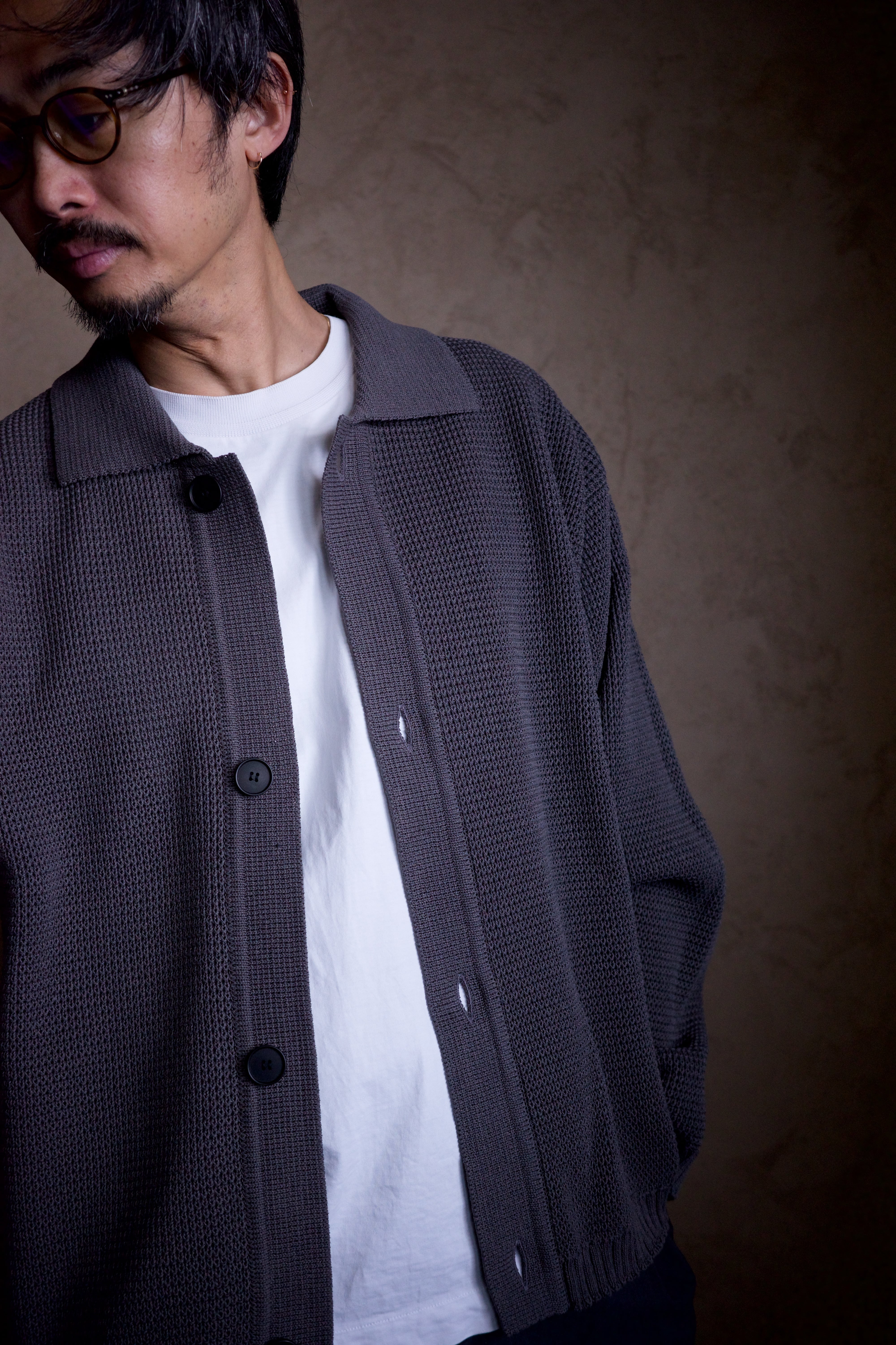 ポリエステルと和紙の混紡糸で7ゲージに編んだ、ニットブルゾンです。