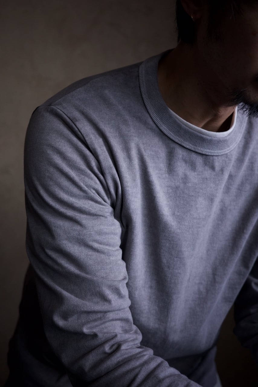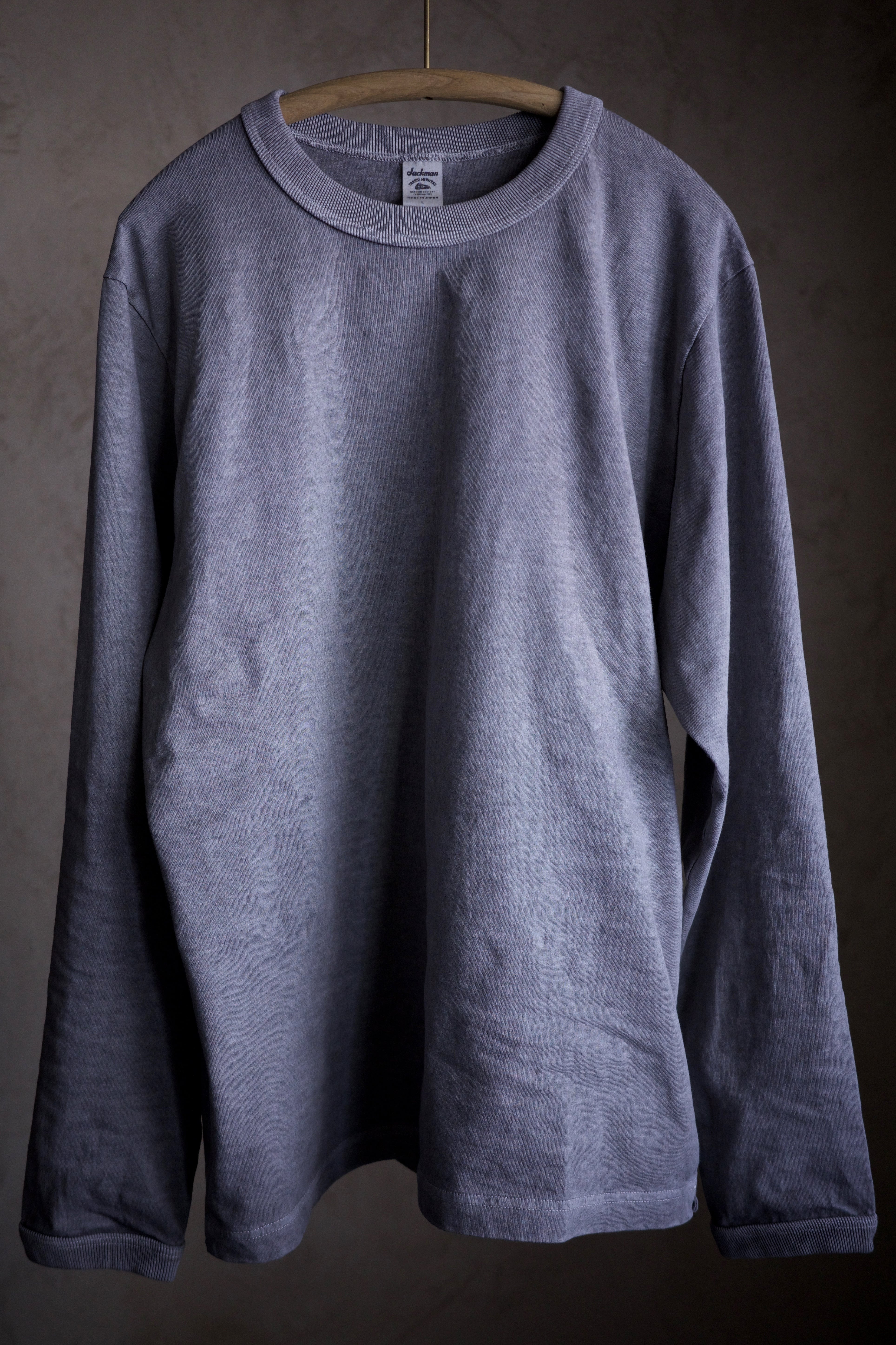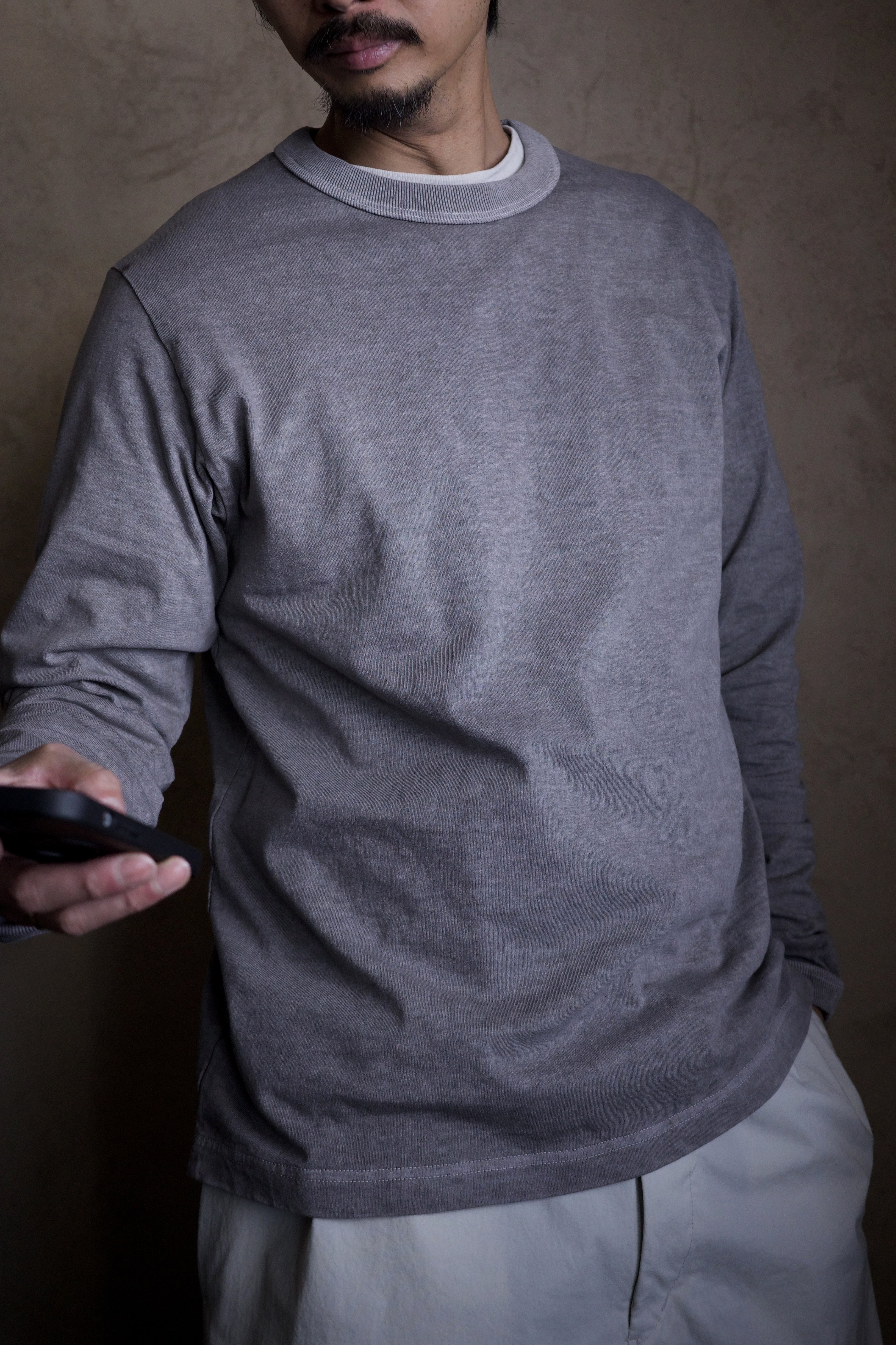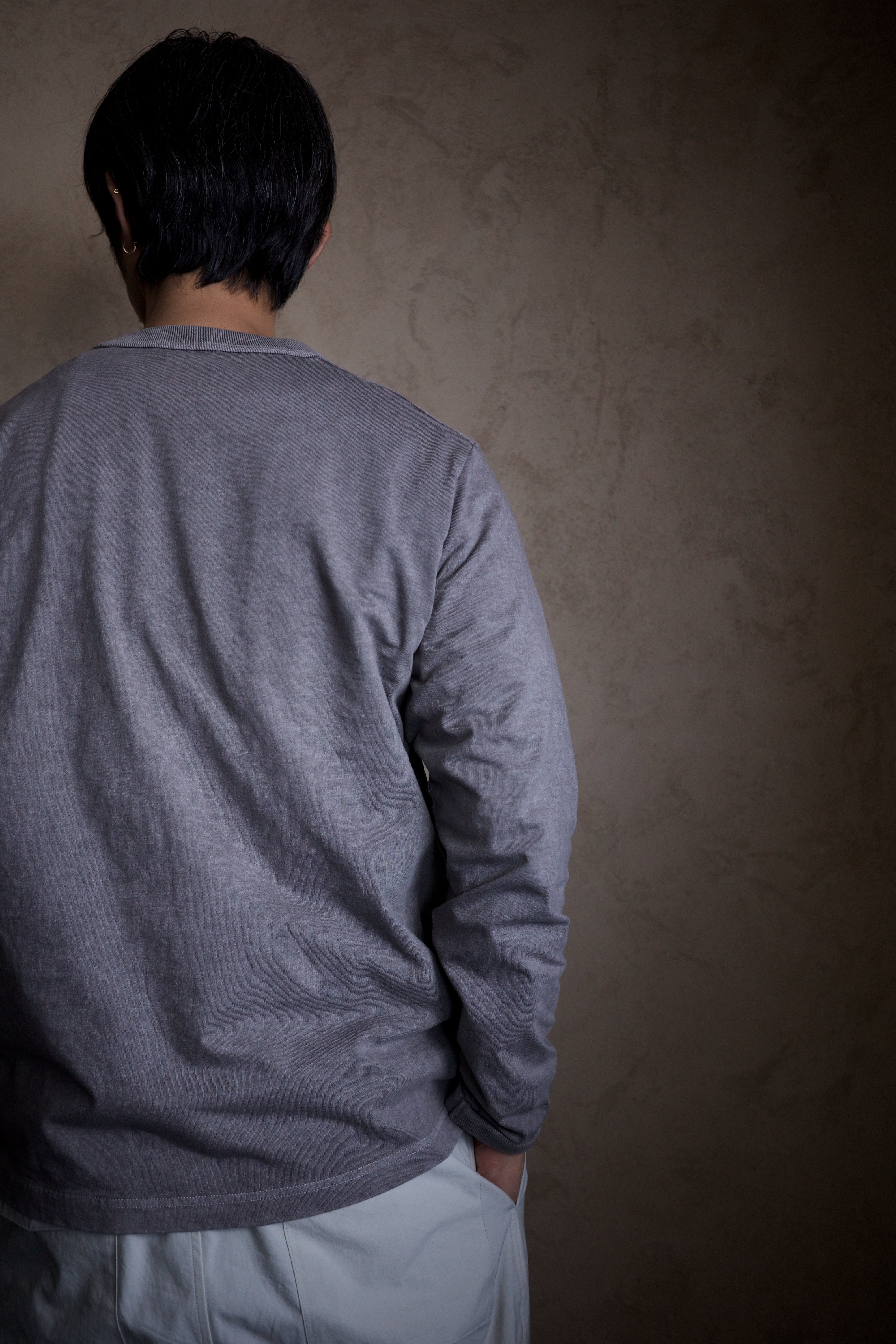 乾燥感がありザラッとした肌触りが特徴のアメリカ綿を、空気紡績によって粗野な表面感に仕上げたロンTです。褪せたような色味も最高。ガシガシとヘビロテで着倒してほしい一枚です