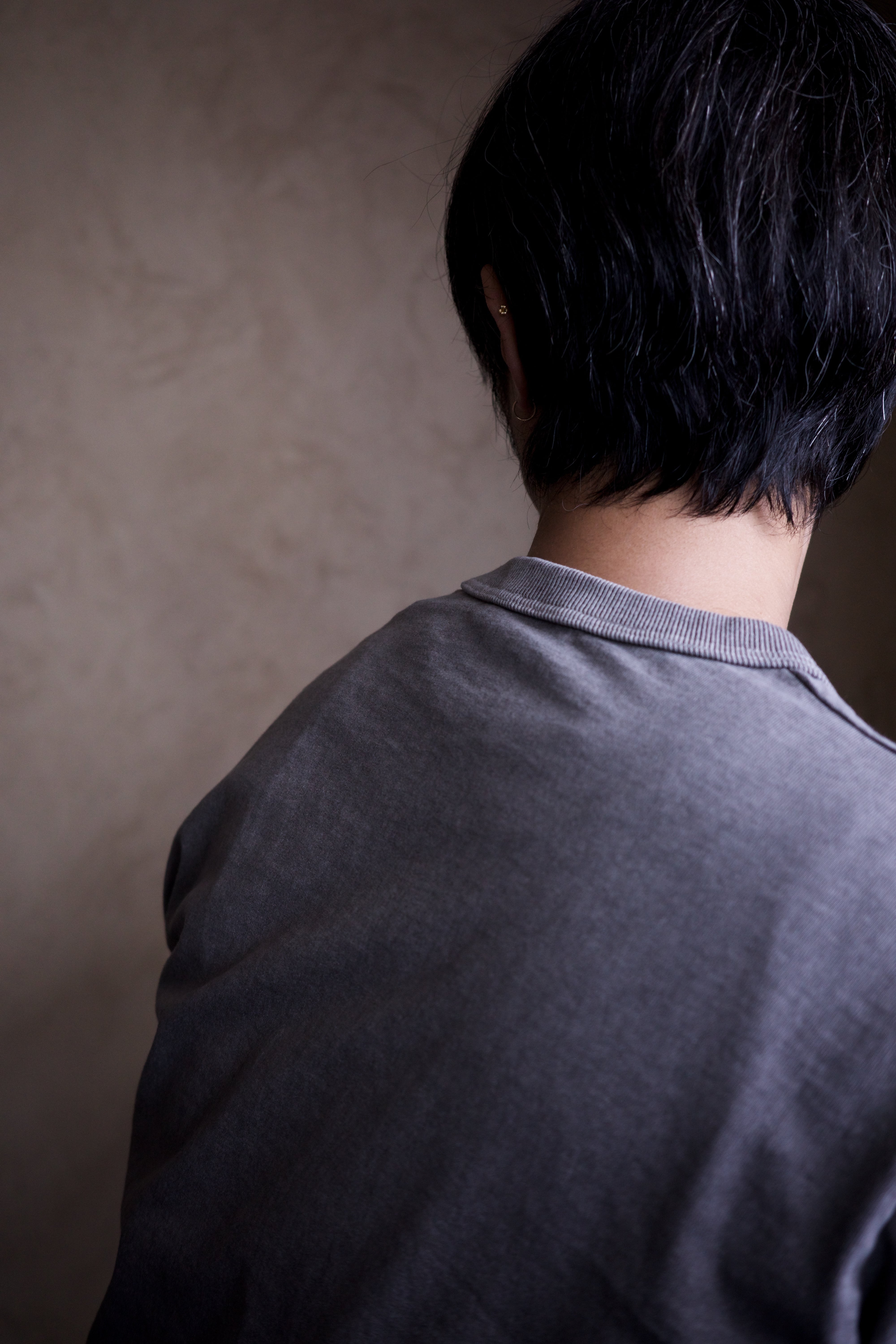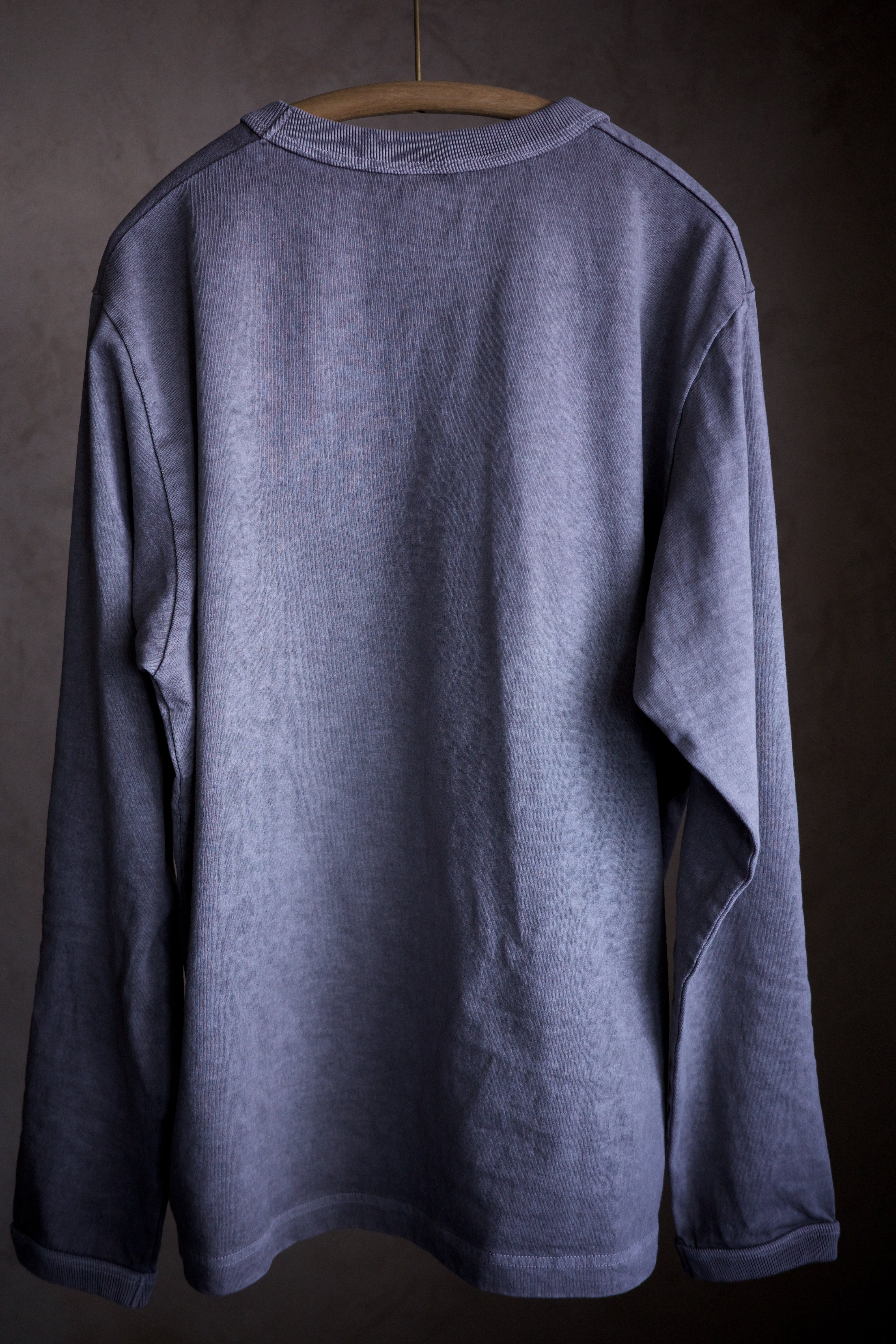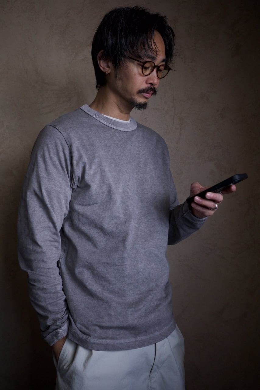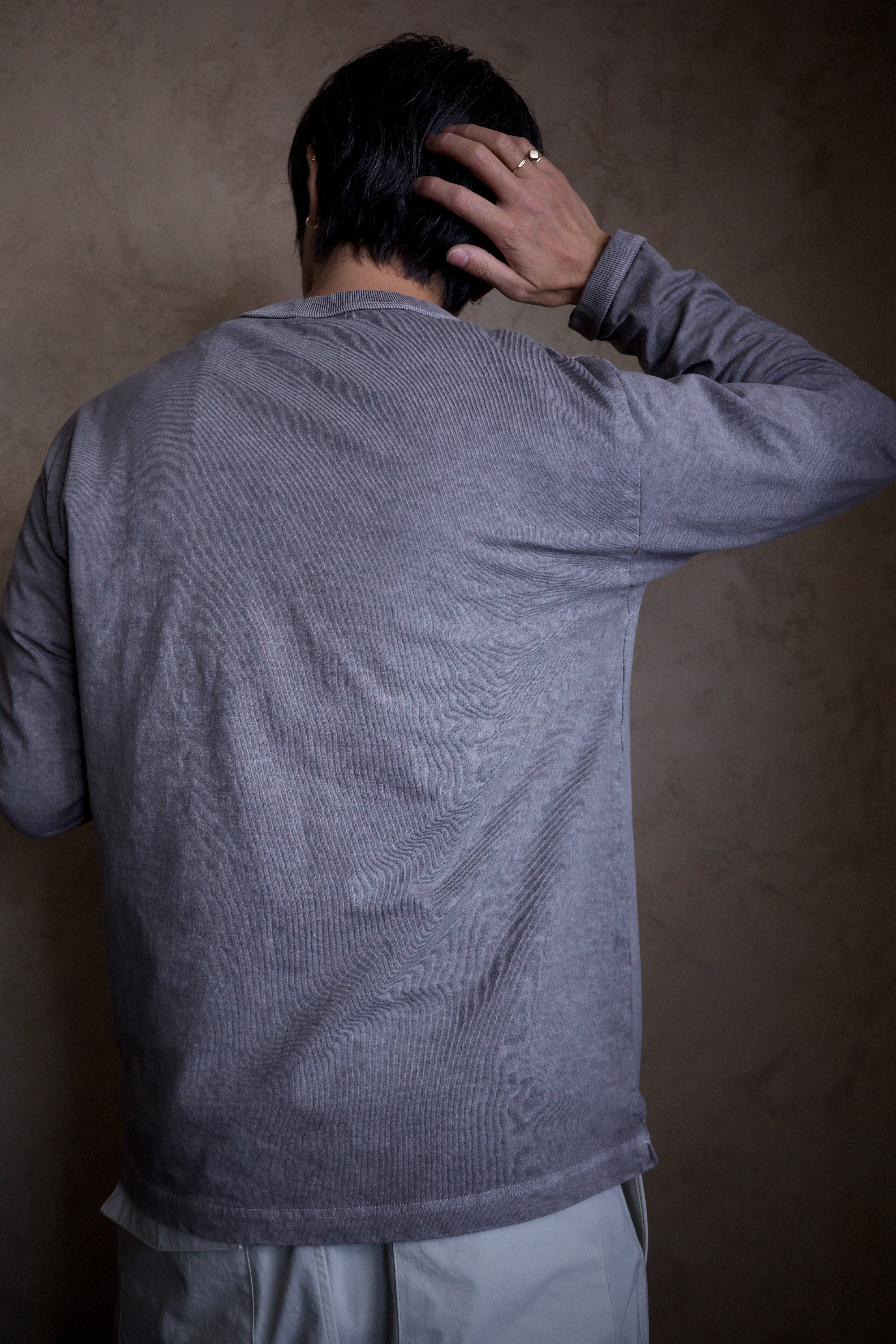 乾燥感がありザラッとした肌触りが特徴のアメリカ綿を、空気紡績によって粗野な表面感に仕上げたロンTです。褪せたような色味も最高。ガシガシとヘビロテで着倒してほしい一枚です