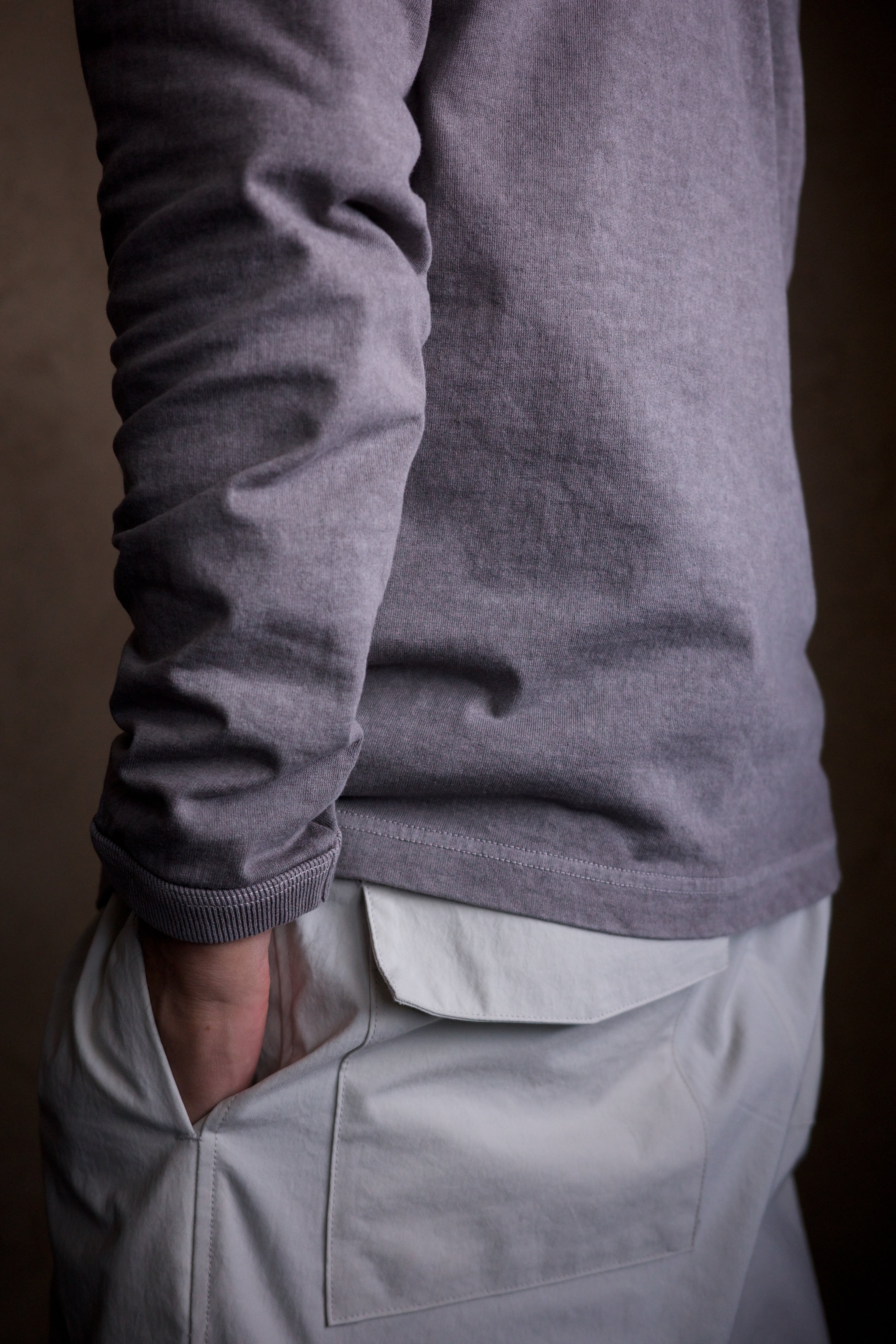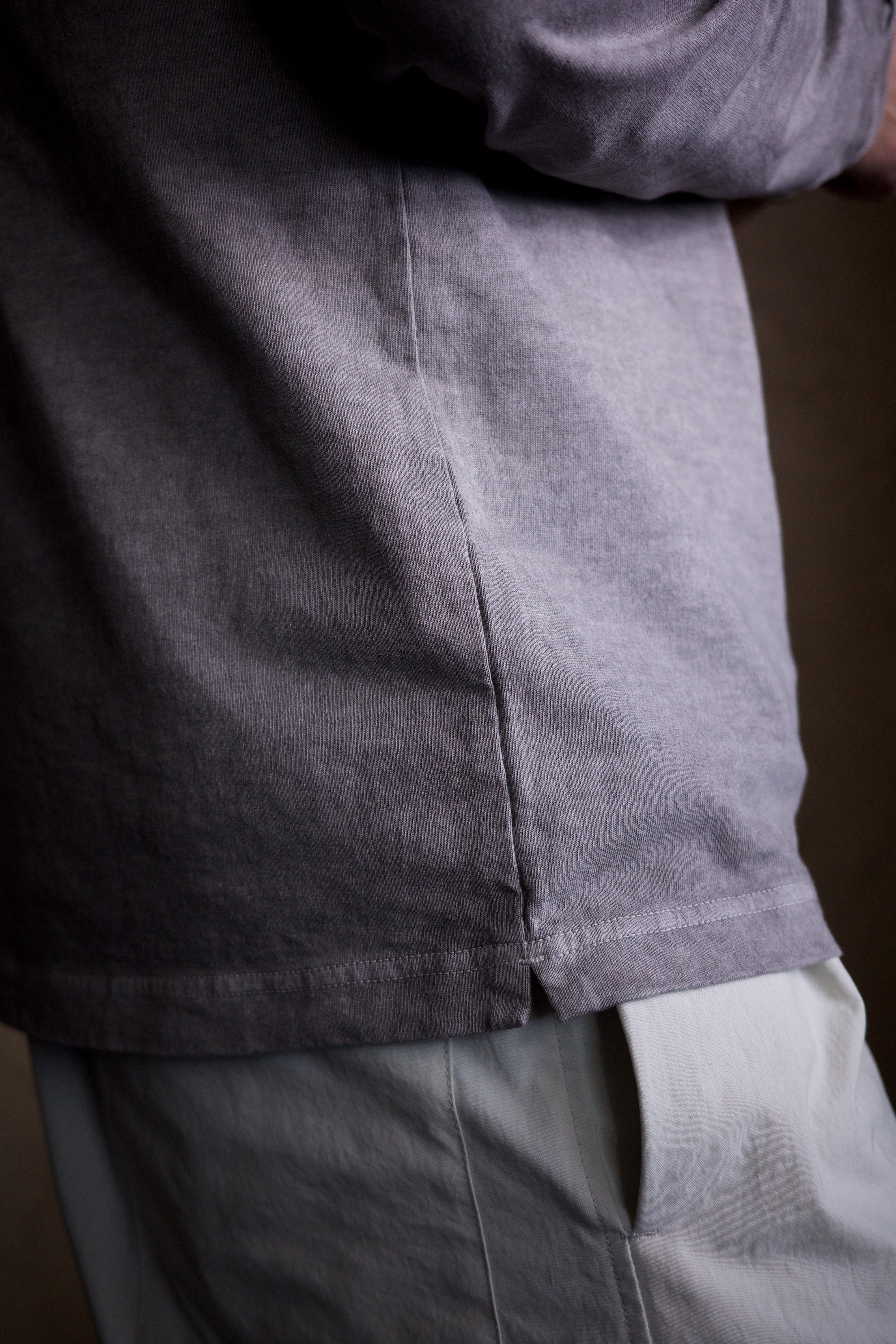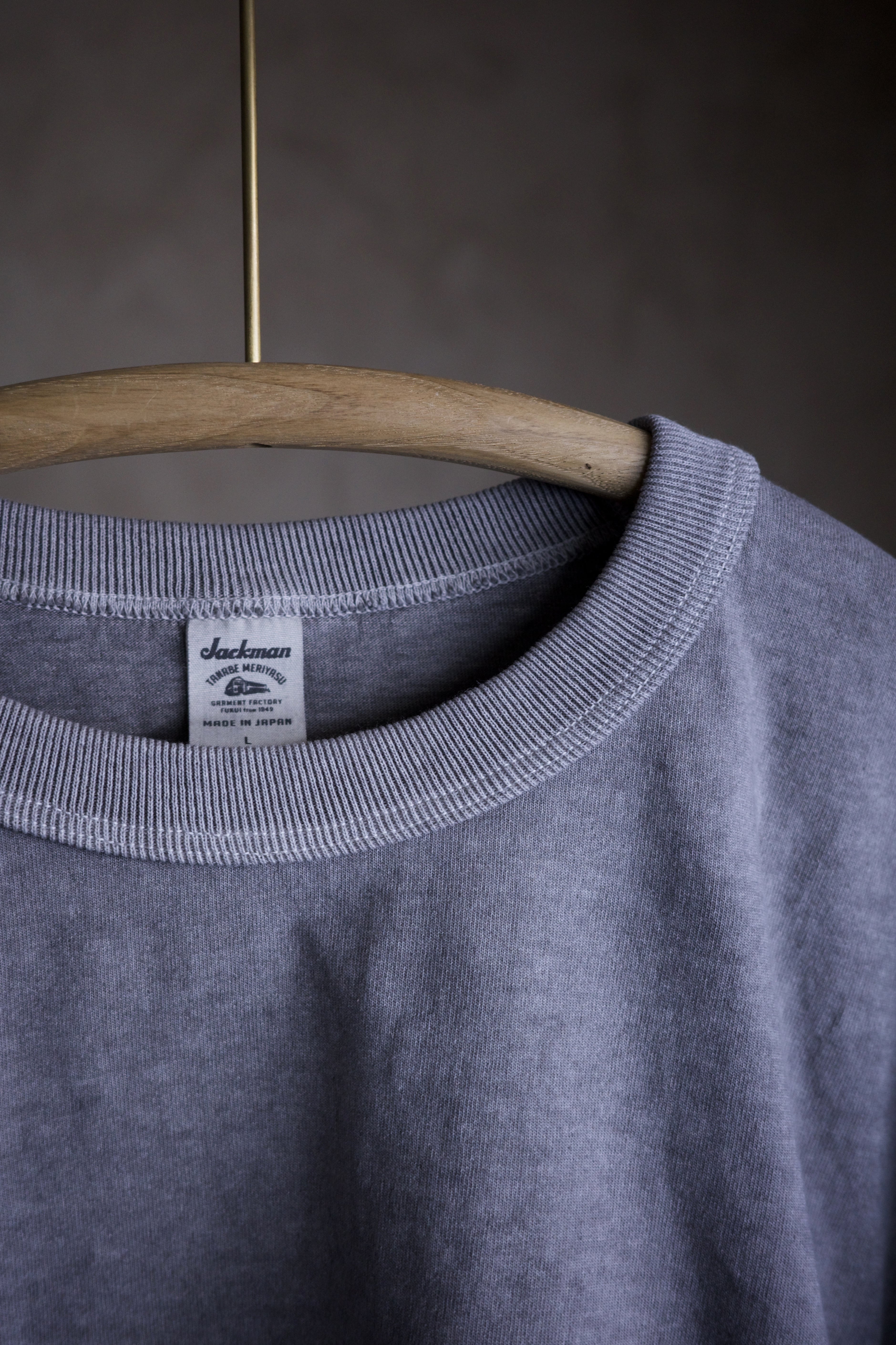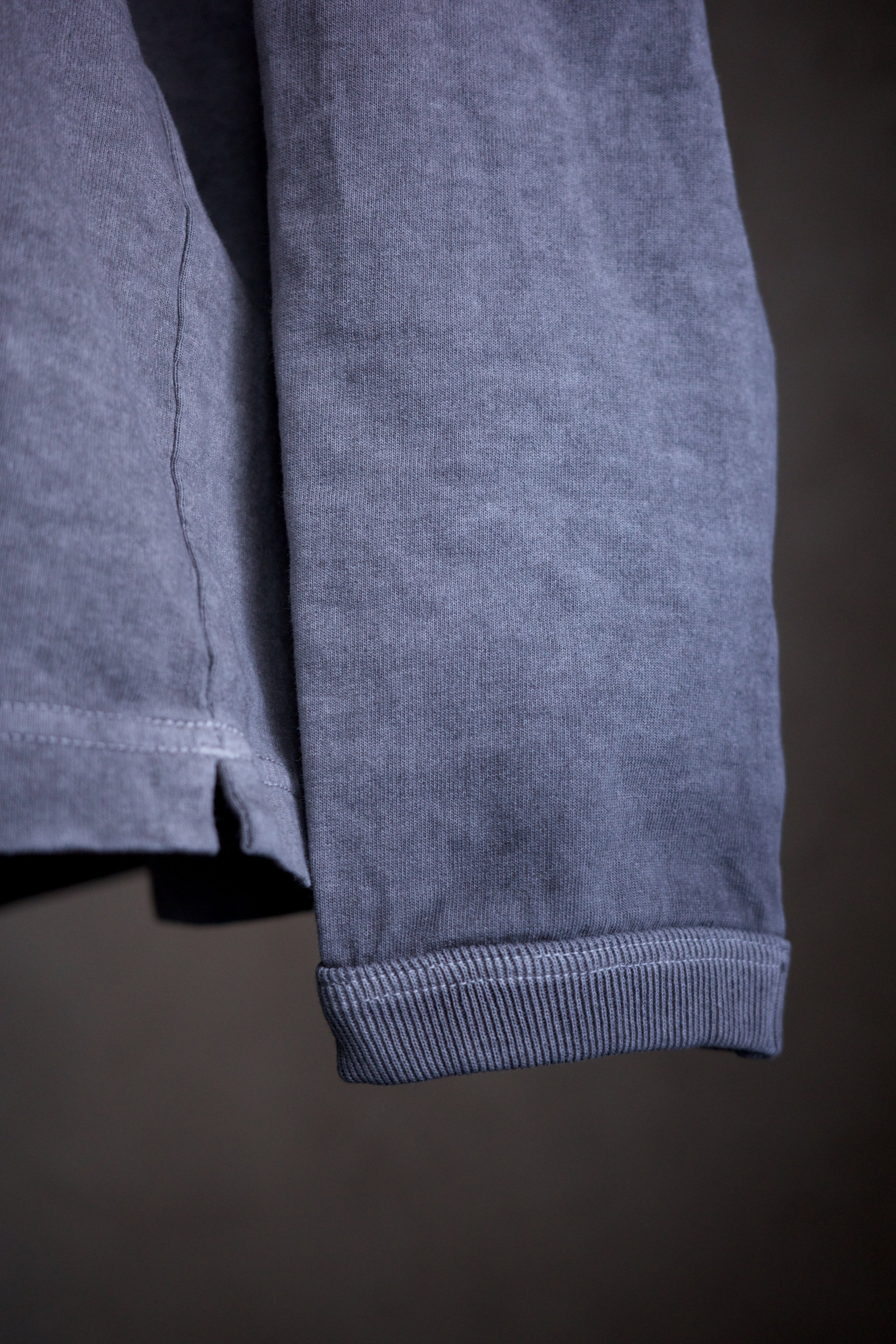 乾燥感がありザラッとした肌触りが特徴のアメリカ綿を、空気紡績によって粗野な表面感に仕上げたロンTです。褪せたような色味も最高。ガシガシとヘビロテで着倒してほしい一枚です