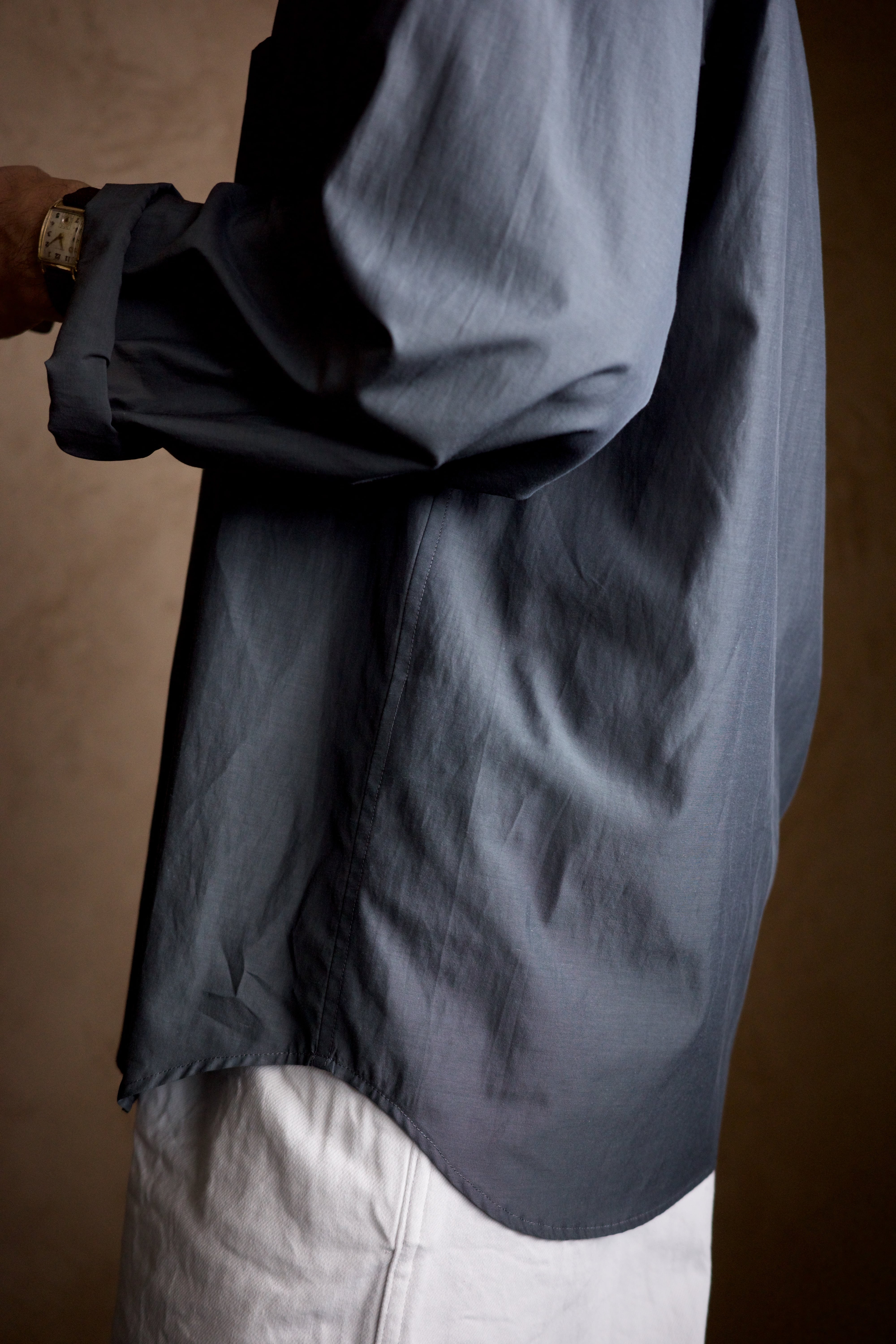 袖口を敢えて筒にしているので、腕まくりも容易。くるくるっとまくって着るのもおすすめです。