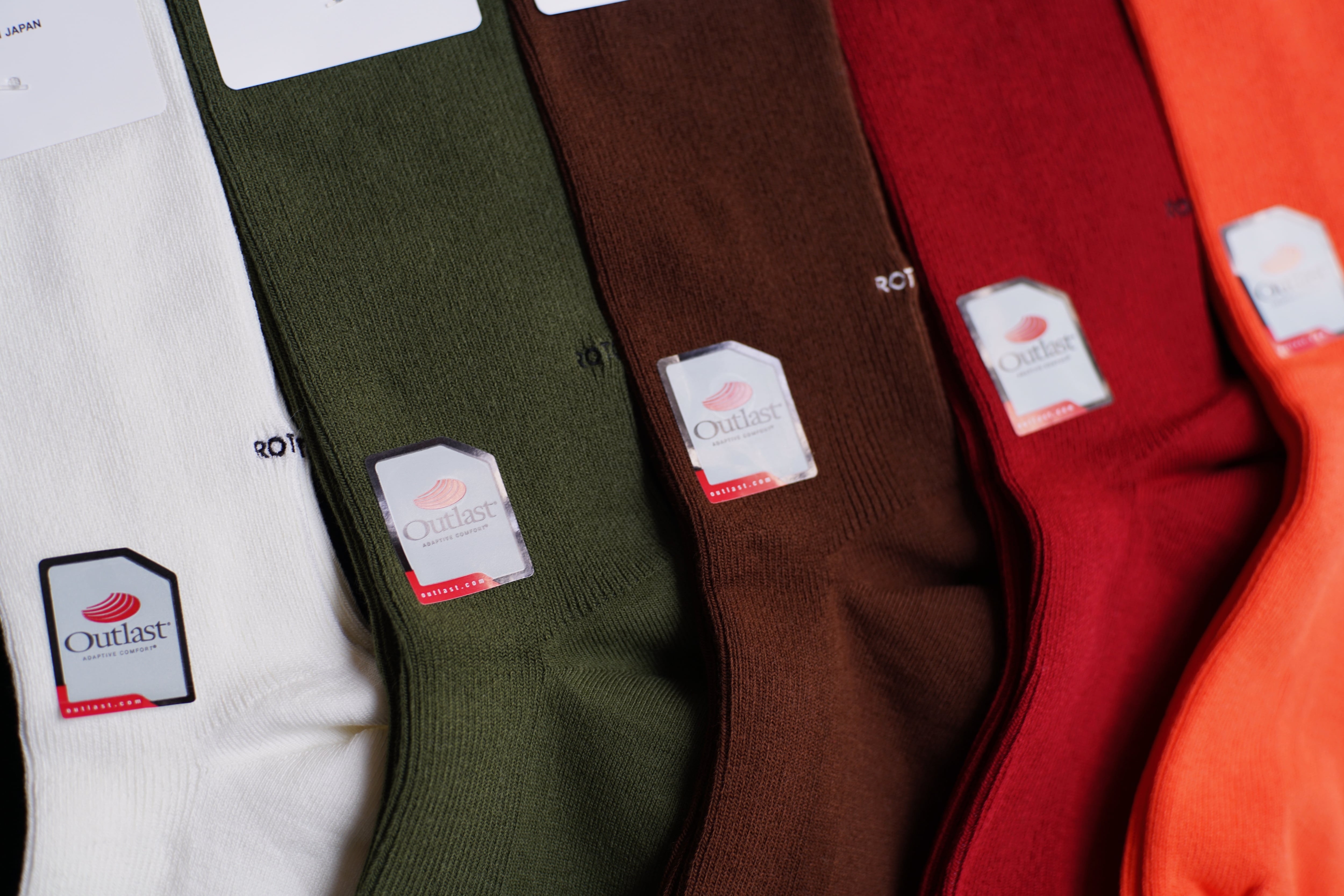 温度調節機能糸であるOUTLASTを織り込んでるから、外の気温が暑くても寒くても、靴下の中は常に31〜33℃にコントロールしてくれるから、どの季節でも快適な履き心地