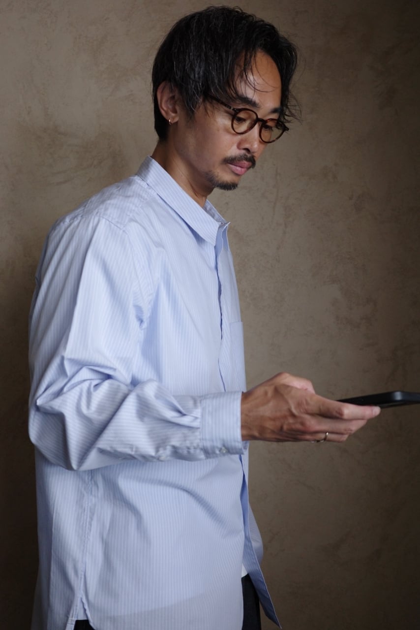 オリジナル先染めブロード素材の定番シャツは、柔らかい肌当たりも含めて良い生地感です。