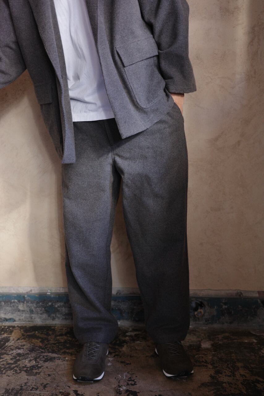 ジャケットの大きめポケットのアクセントと、パンツの落ち感もとても良い感じ。