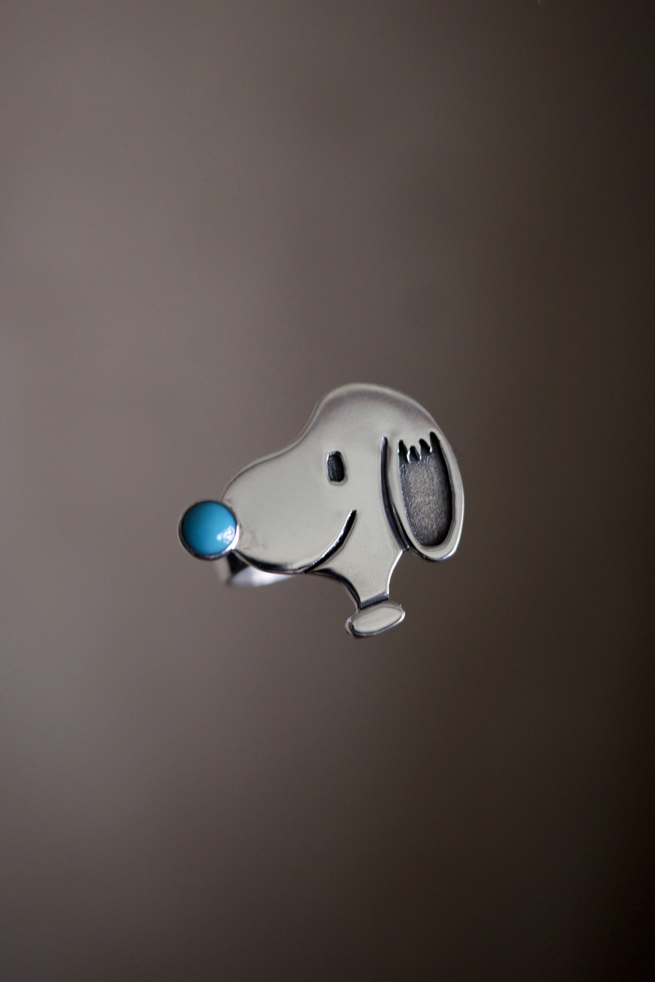 スヌーピーの鼻がターコイズになってるスペシャルリング。こちらは日本で当店と大阪のDAKOTAさんでしか手に入れることができない限定品。ナバホ族のアーティスト、ハーマンバンデバーにお願いして制作していただいた特別なキャラクターリングです。一点のみの入荷です